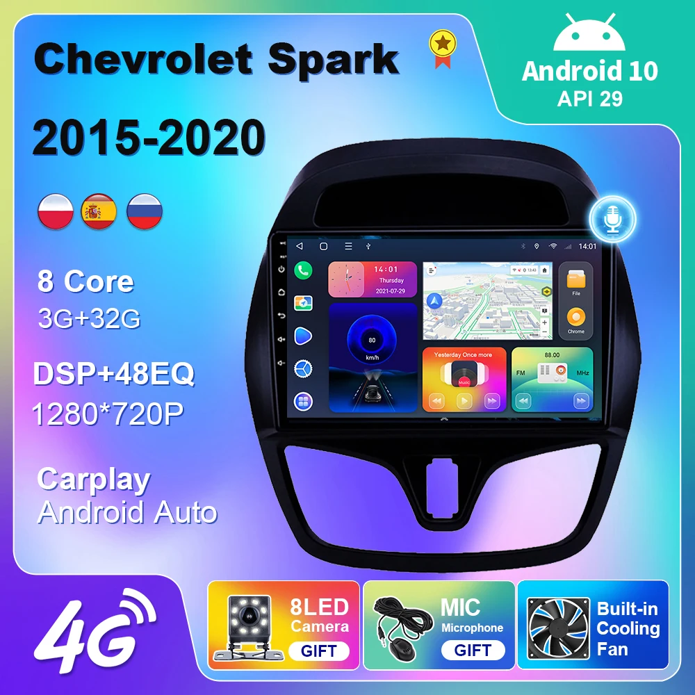 Автомагнитола для Chevrolet Spark Beat 2015-2020, 4G, Wi-Fi, Carplay, Android, мультимедийный видеоплеер, навигация, GPS, Android, DVD