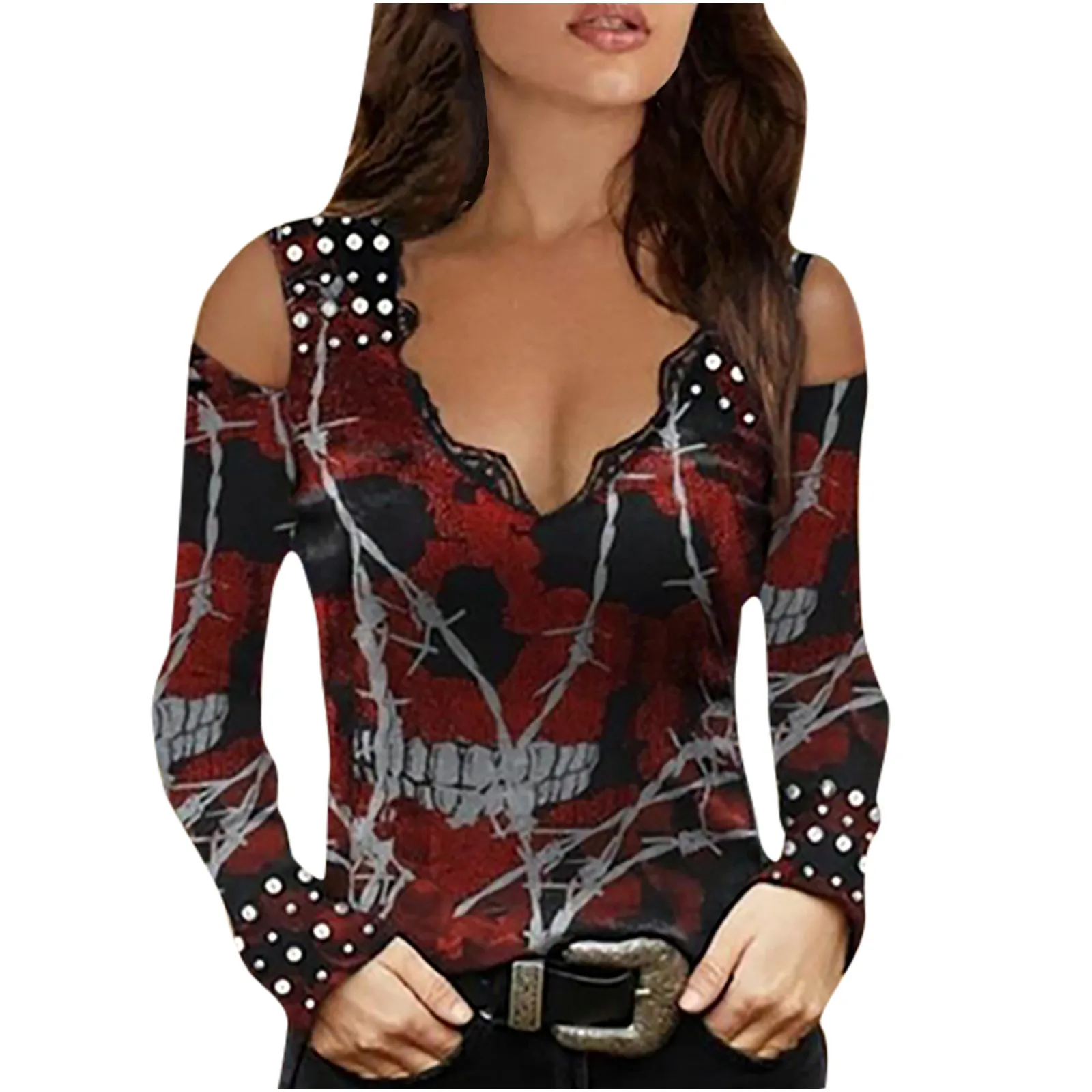 Новые модные женские футболки, сексуальная одежда для Хэллоуина, Рубашки без бретелек с длинным рукавом и V-образным вырезом, топы, женская одежда