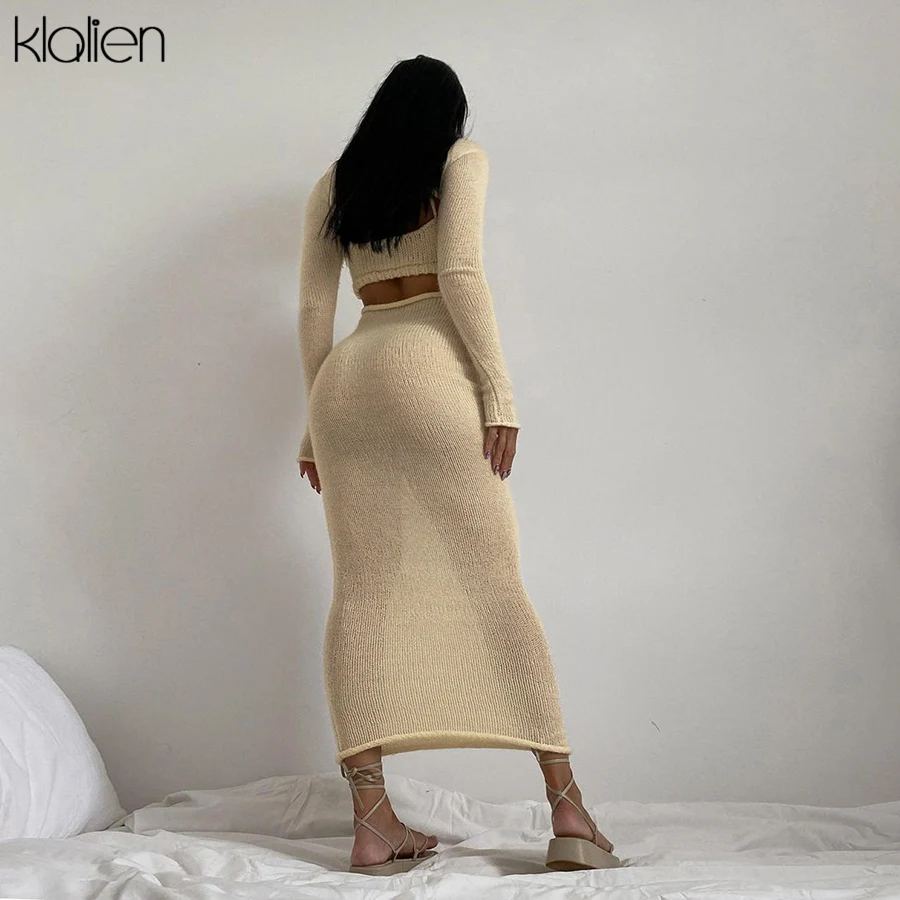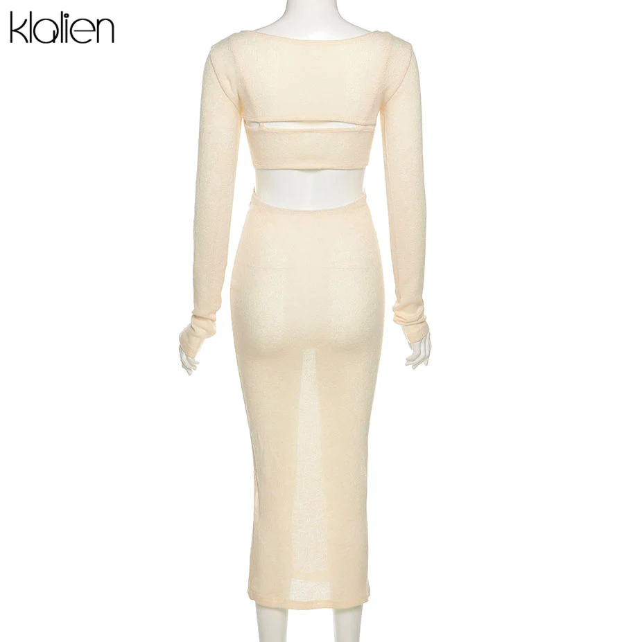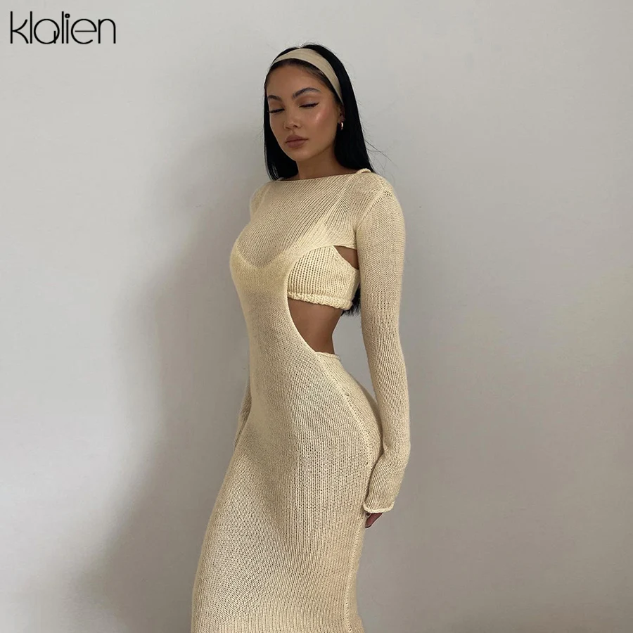 KLALIEN модное сексуальное платье из двух частей с вырезами для Женщин Осеннее новое простое универсальное базовое женское уличное платье Y2K облегающее длинное платье