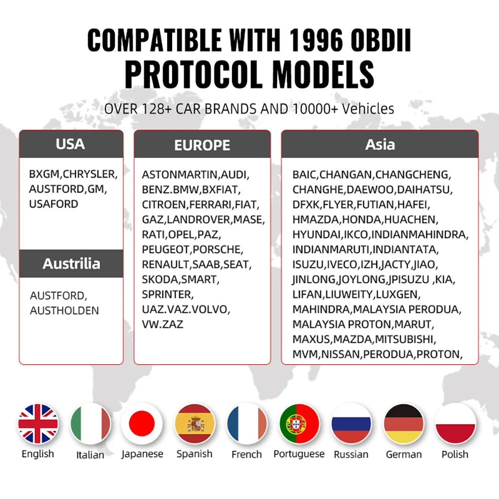 Для AUDI, для BENZ, для BMW, для CHRYSLER, для CITROEN, для DACIA, для DAEWOO, для FIAT, для GM, для HOLDEN, для HONDA, для HYUNDAI, для JAGUAR, для JPISUZU, для KIA, для LANDROVER, для MAHINDRA, для MARUTI, для MAZDA, для MINI, Для MITSUBISHI, для NISSAN, для OPEL, для PEUGEOT, для PORSCHE, для RENAULT, для SAAB, для SEAT, для SKODA, для SMART, для SPRINTER, для SUBARU, для SUZUKI, для TATA, для TOYOTA, для USAFORD, для VOLVO, для VW... обновлениеПожалуйста, свяжитесь со службой поддержки клиентов для получения подробной информации