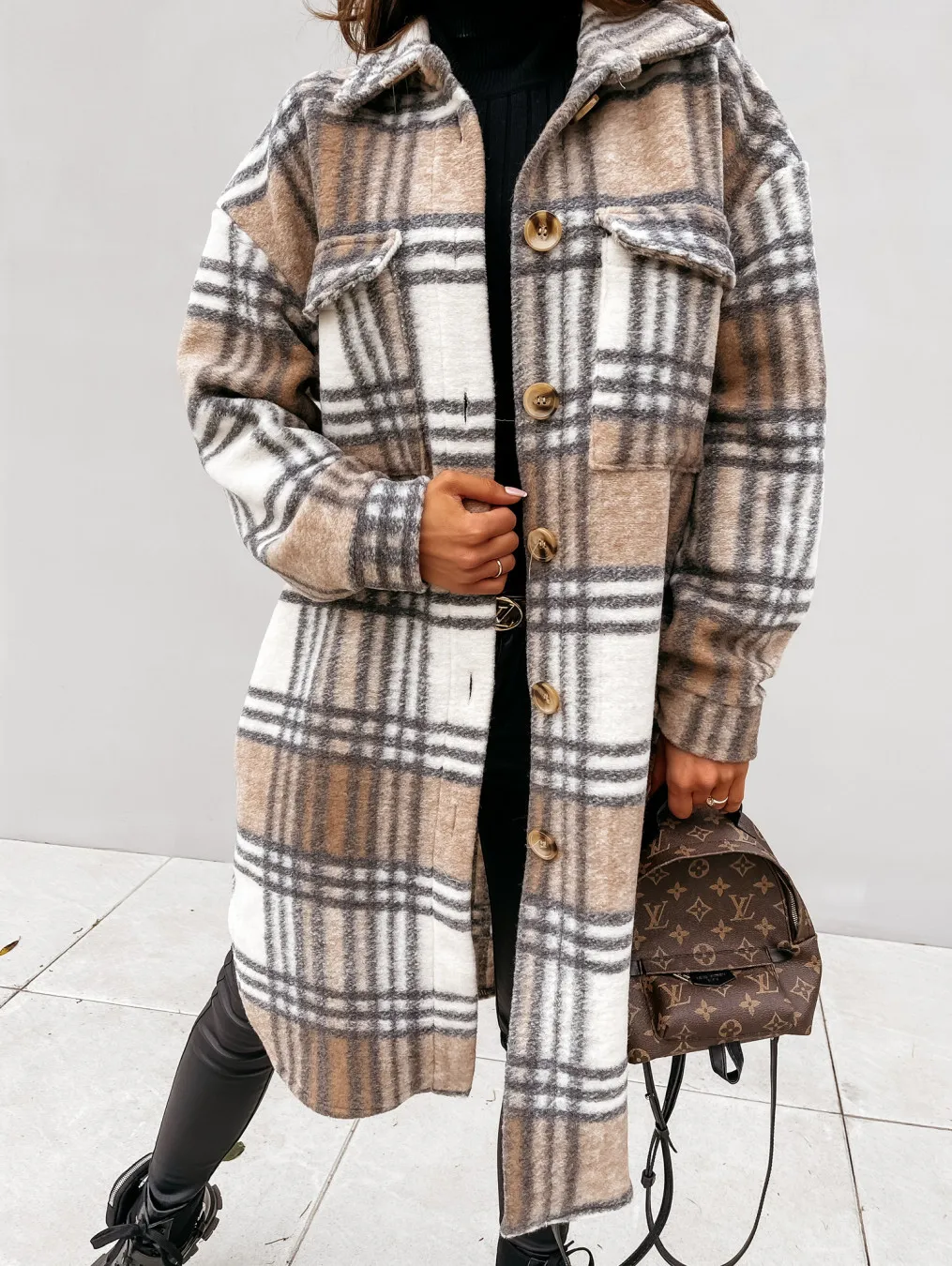 Пальто женское длинное клетчатое с отложным воротником, модная своб...
