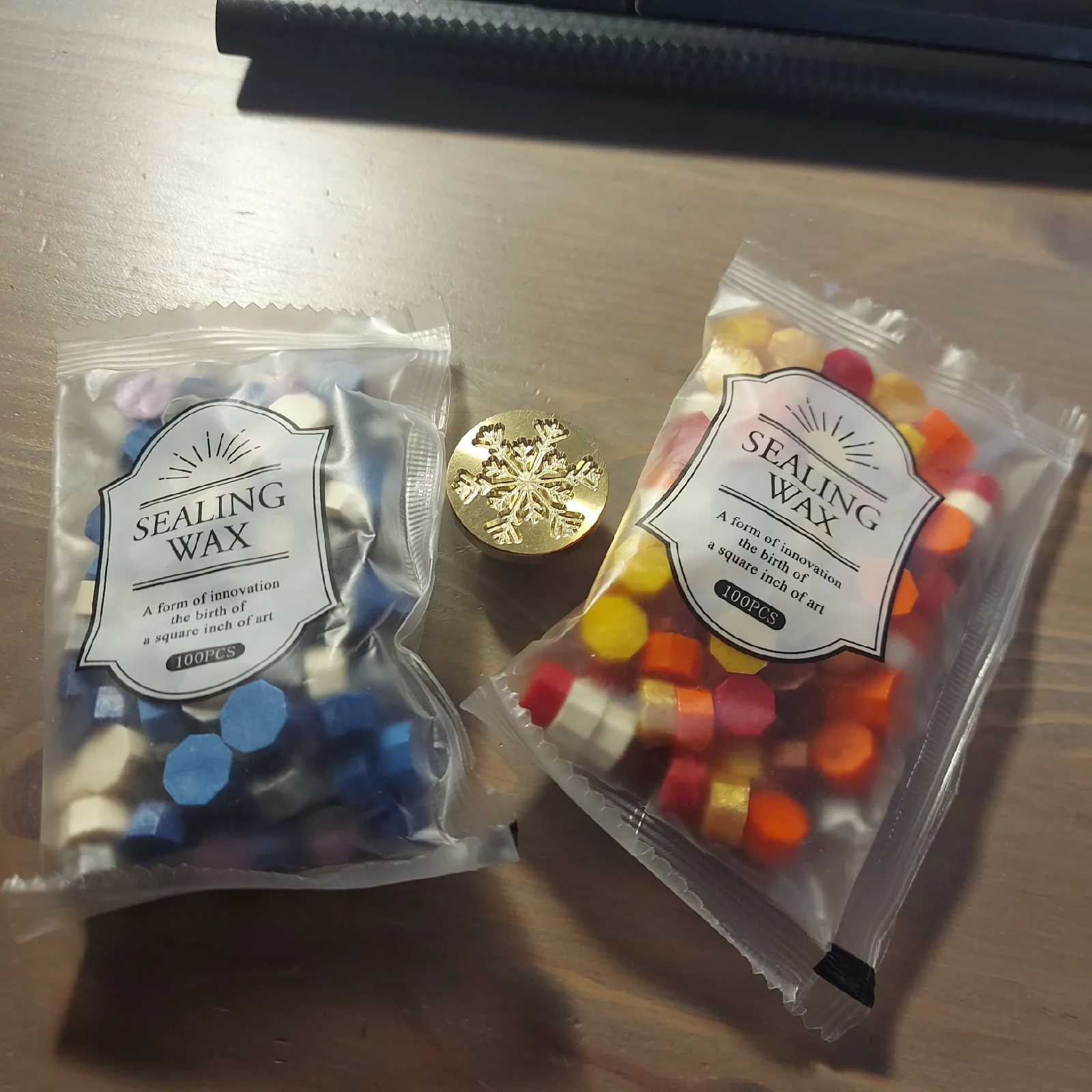 Заказывала у продавца один штамп и две упаковки разного воска. Единственный минус, думала что пакетики будут побольше, но объём пакетика соответствует своей цене (заказывала во время скидок - 11.11, тогда цена за один пакетик была около 189р) Доставка была очень быстрой, рада что всё пришло до нового года, потому что заказывала как раз к оформлению подарков на нг. :)