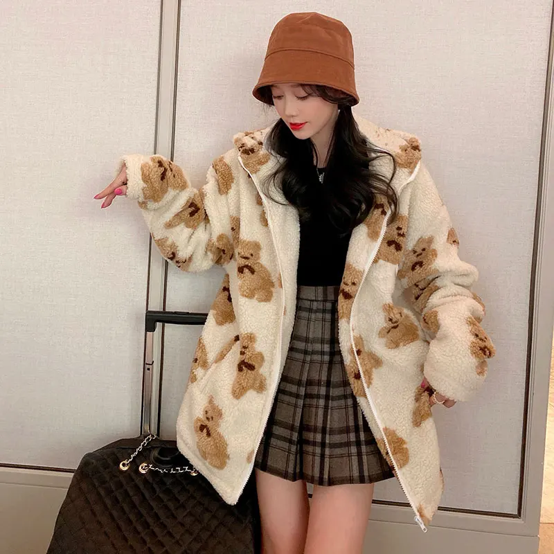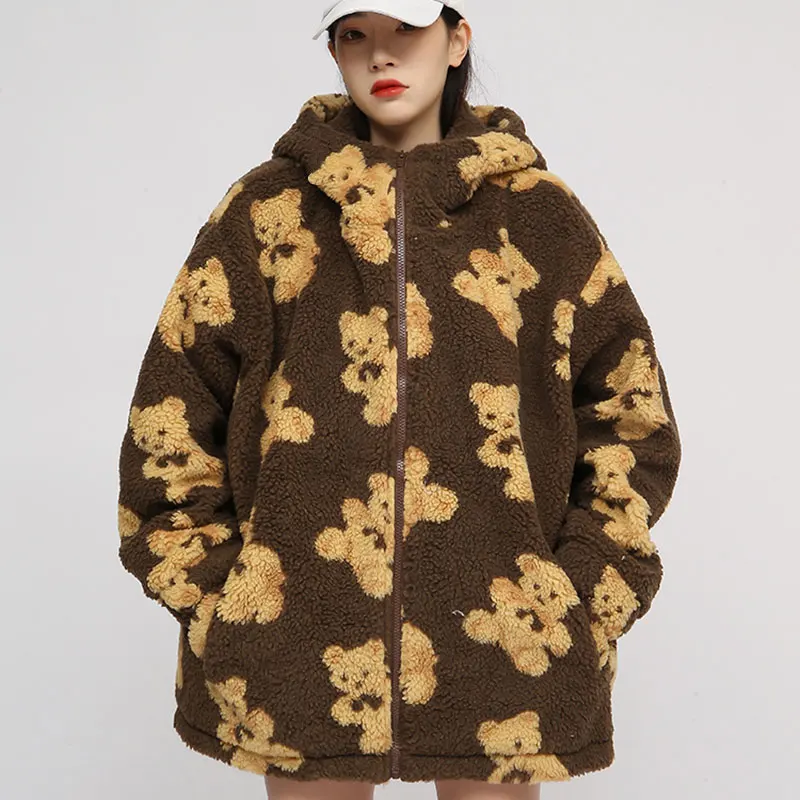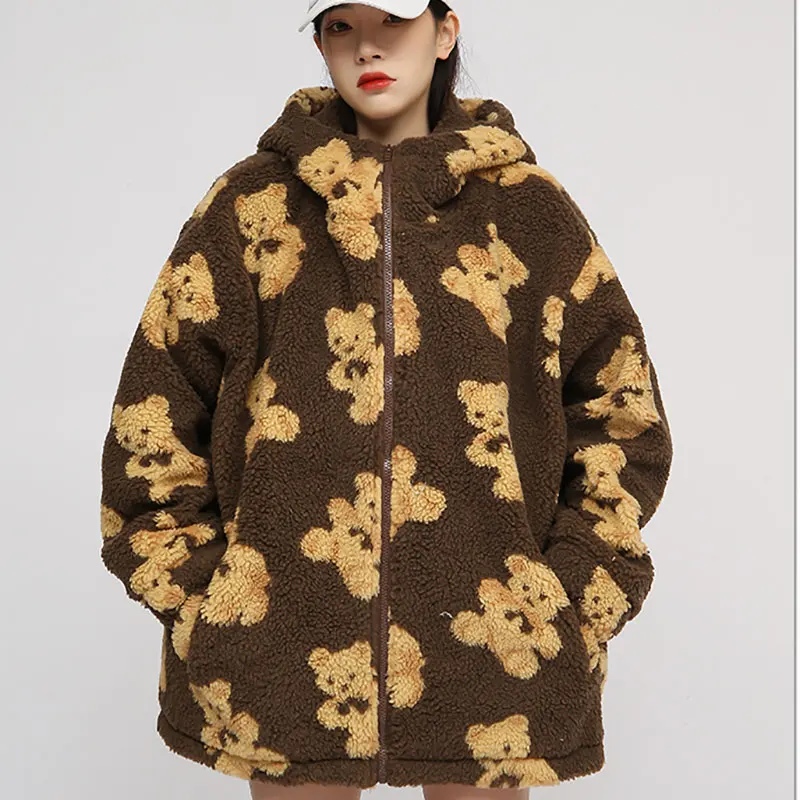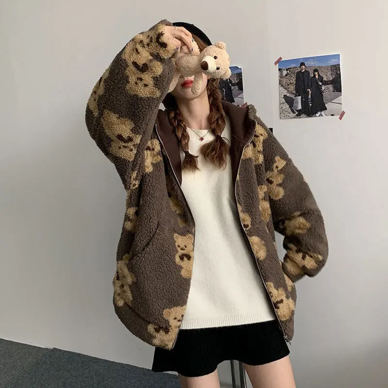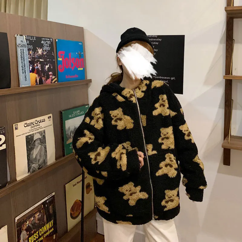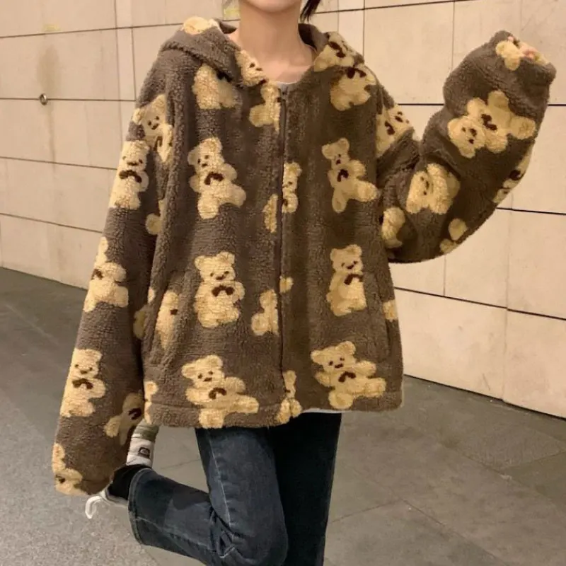 Новинка 2021, пушистая толстовка с рисунком медведя, зимняя теплая плюшевая Милая толстовка, Женская Корейская Свободная куртка в стиле ретро для мужчин и женщин