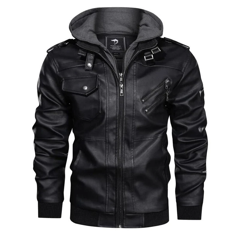 Мужская куртка из искусственной кожи с карманами и капюшоном, осенняя ветровка в стиле панк, мотоциклетная куртка, Мужское пальто со съемной шапкой