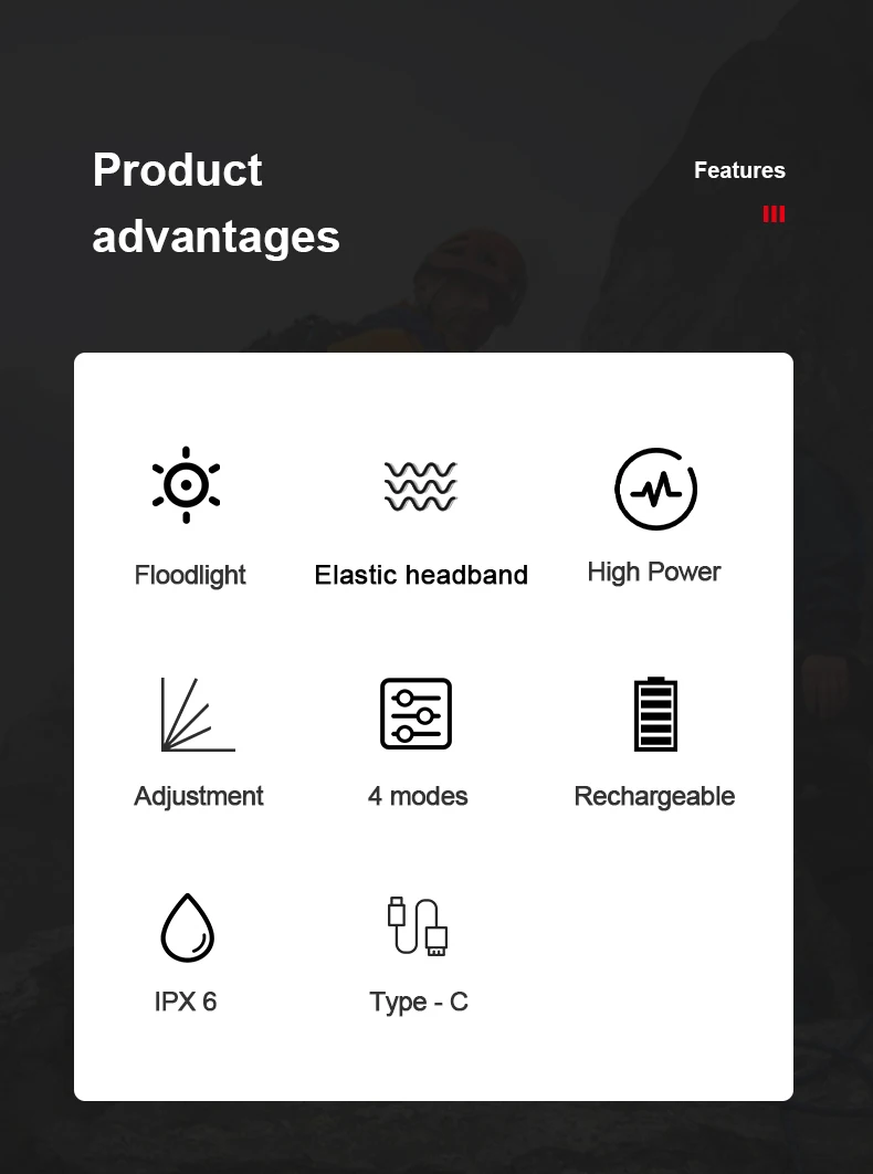 Водонепроницаемость фары составляет IPX6, вы можете использовать его в условиях сильного дождя, но не помещайте его в воду в течение длительного времени. Фонарик очень яркий, пожалуйста, не освещайте глаза других.