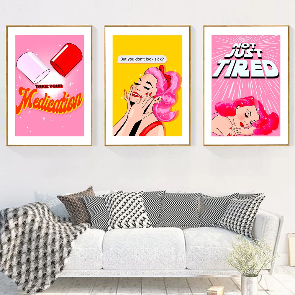 Настенная картина в скандинавском розовом стиле с изображением хронических заболеваний Абстрактная Картина на холсте с изображением усталой таблетки мультяшный Современный домашний декор