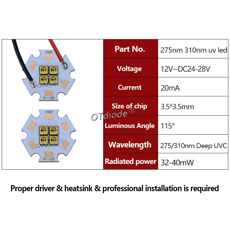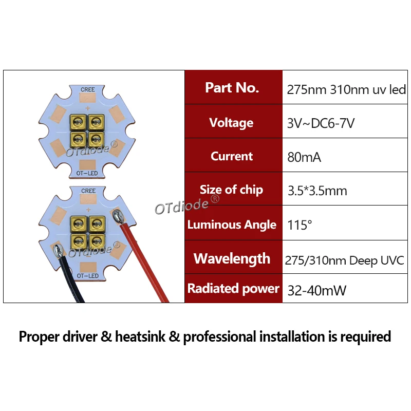 2 шт. 3535 нм глубокий UVC светодиод 32 МВт 40 мВт диод лампа SMD бусины 6 в 12 В 24 В 4 чипа для УФ дезинфекционного оборудования нм