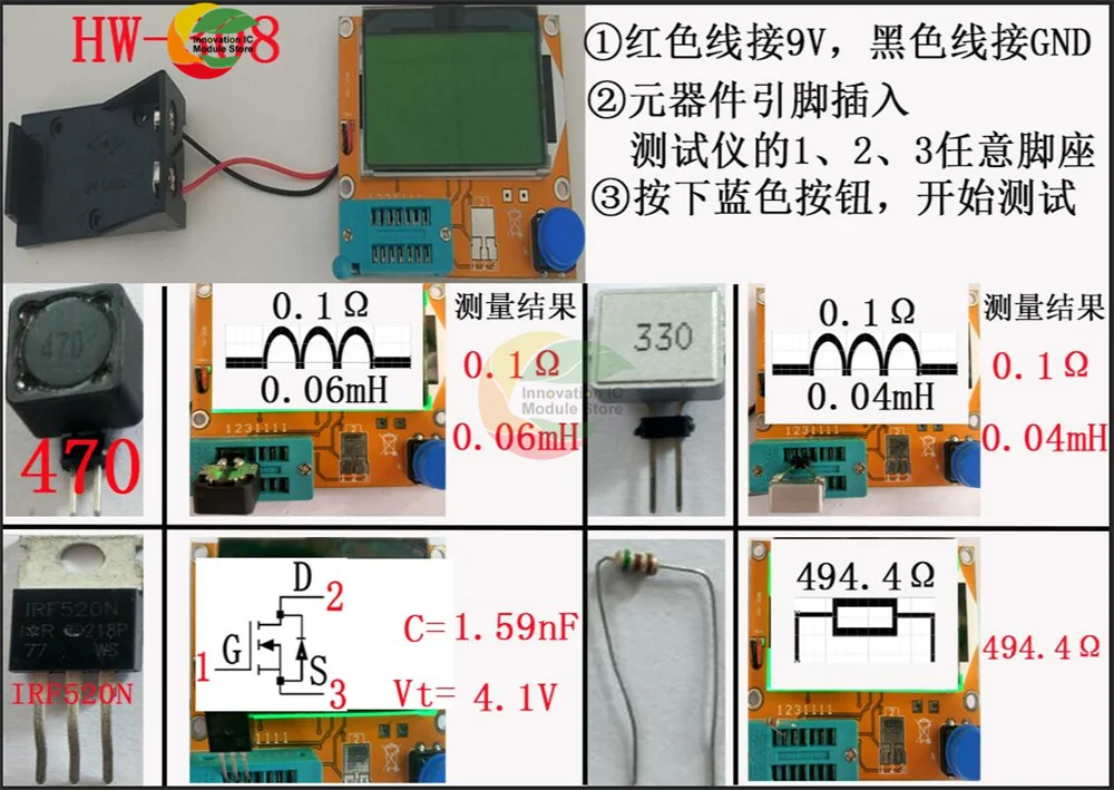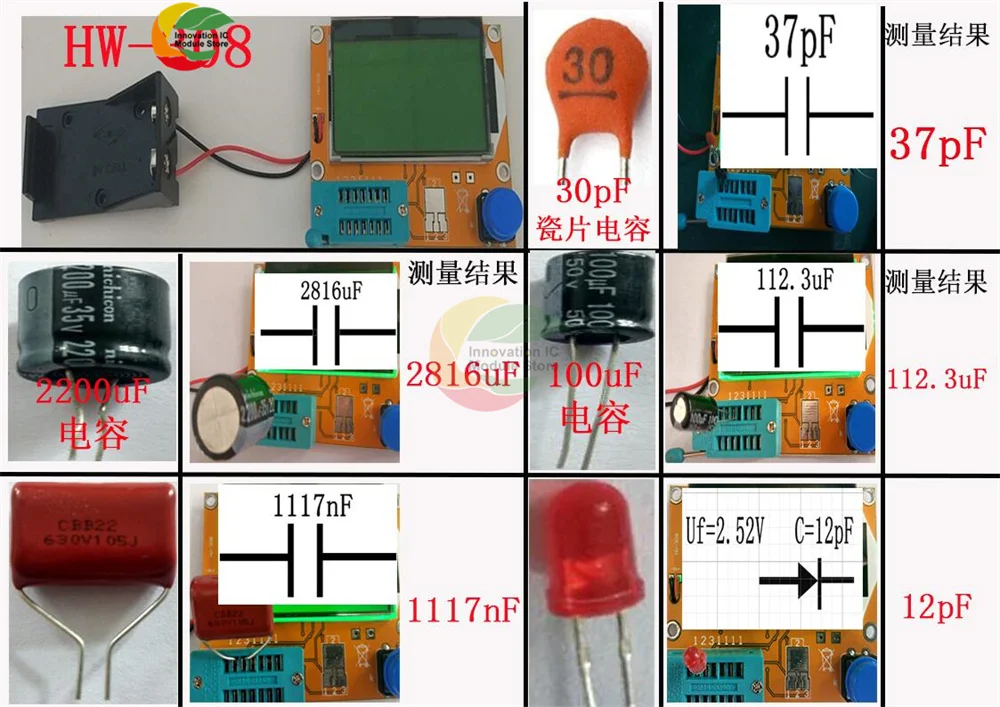 Диапазон испытаний:Индукторы, конденсаторы, диоды, двойной диод, mos, транзистор, SCR, регулятор, светодиодный,Сопротивление, регулируемый потенциометрСопротивление: 0,1 Ом разрешение, максимум 50M ОмКонденсатор: 25pf-100000 мкФ