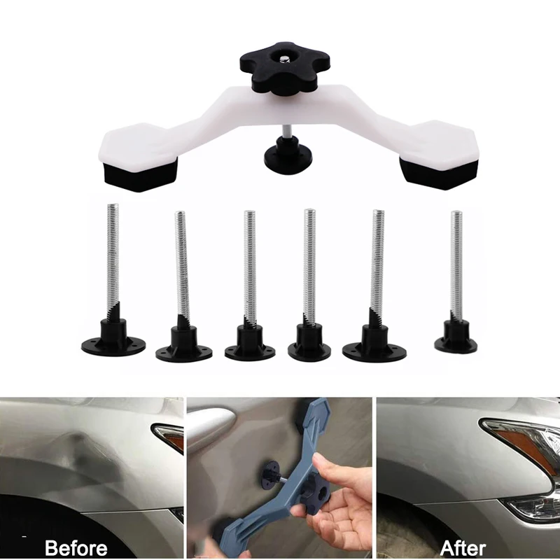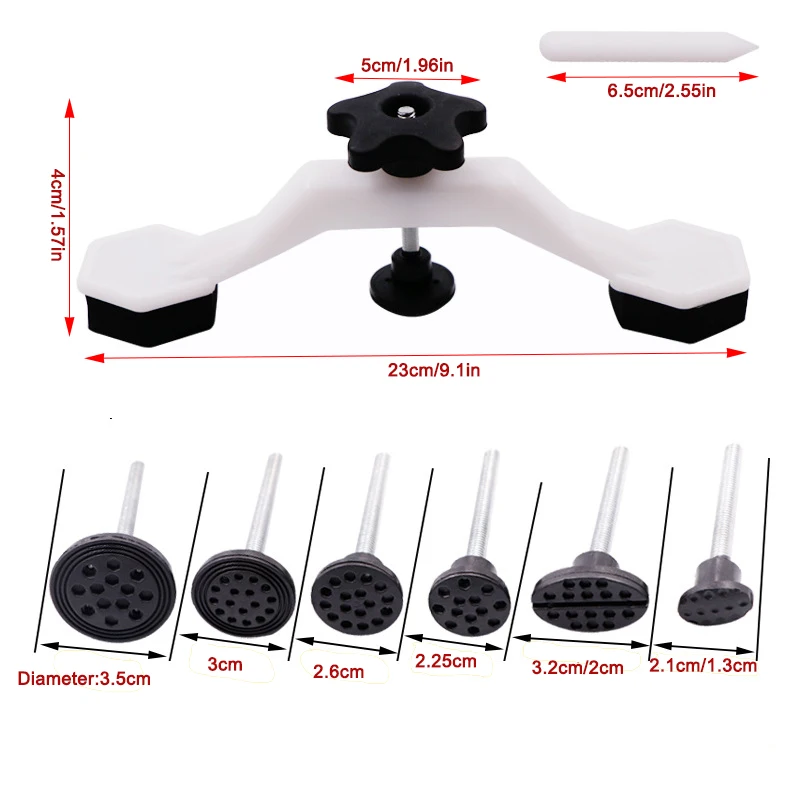 Это безболезненный инструмент для ремонта вмятин с 5 клеевыми вкладками разного размера, 1 съемником моста и ручкой-краном. Благодаря 5 язычкам разного размера он может восстанавливать вмятину разного размера, не повреждая оригинальную краску автомобиля. Это действительно полезный и простой инструмент. Надеюсь, вам удачная покупка.