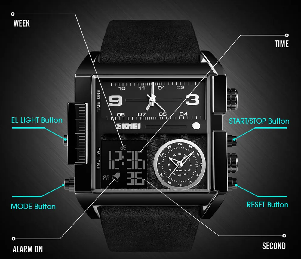 Несколько функций, эти часы имеют 3 времени, хронограф, секундомер, будильник, автоматическую дату и неделю, EL светильник, 12/24 часов.