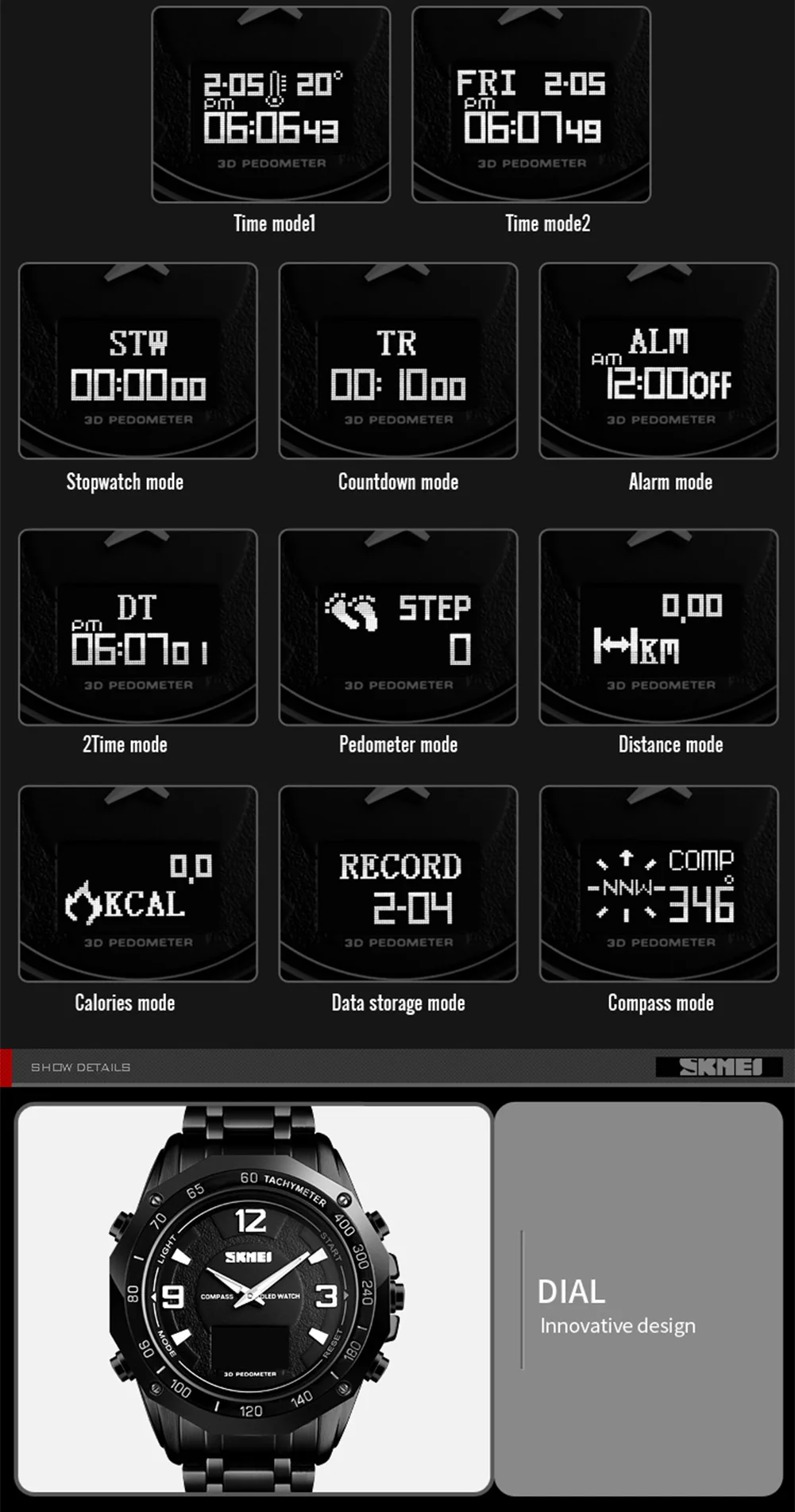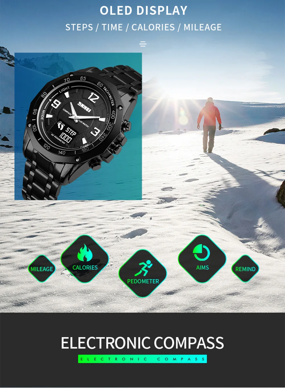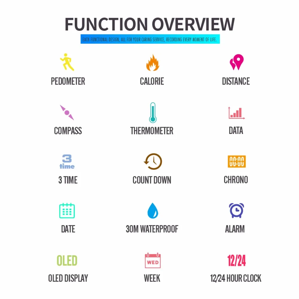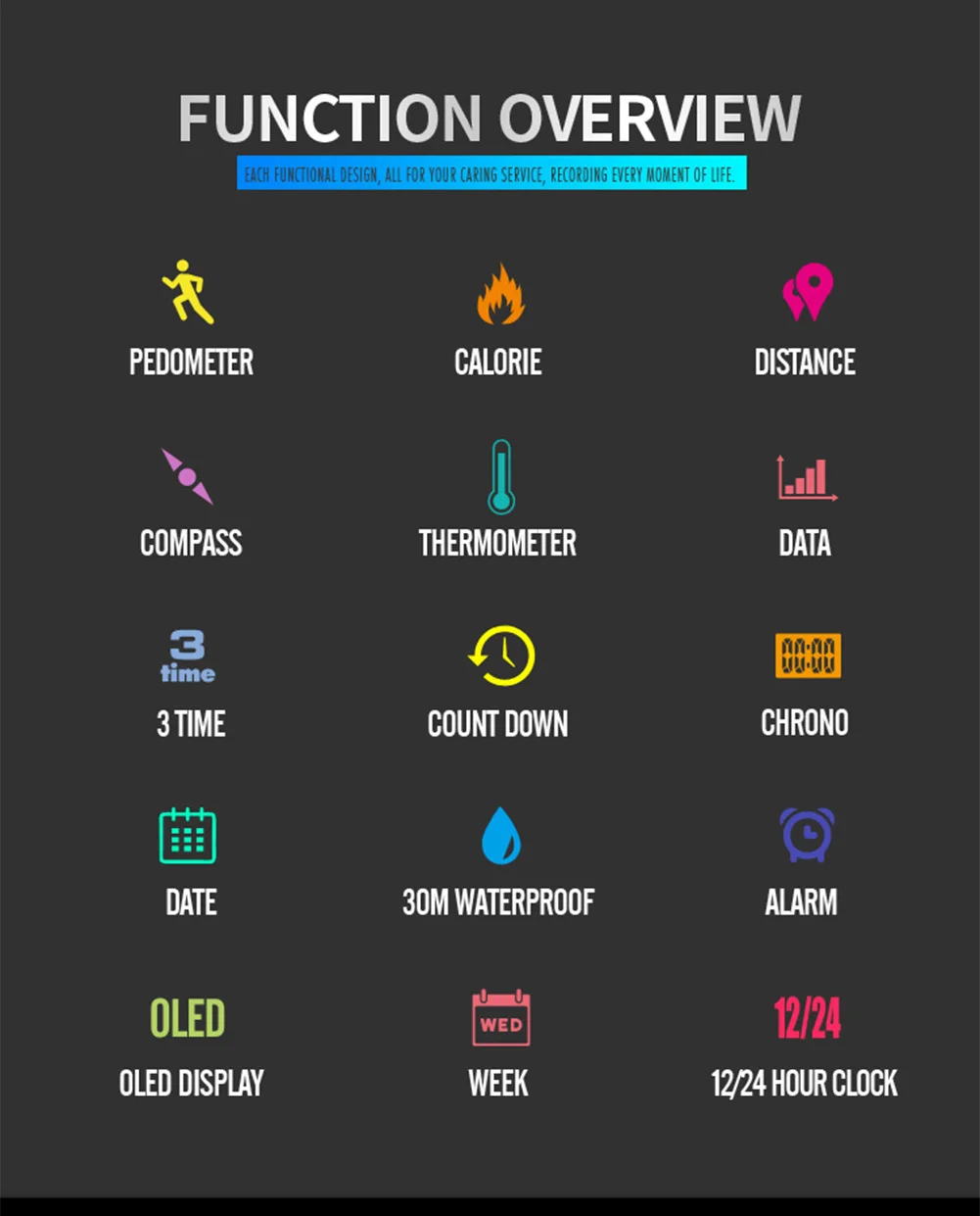 Функции:2 времени, недели, даты, компаса, шагомера, калорий, пробега, данных, расстояния, темометра, секундомера, обратного отсчета, oled-дисплея, 12/24 часов.