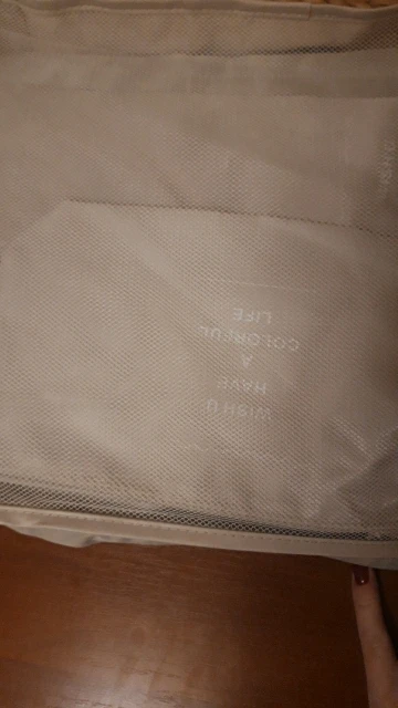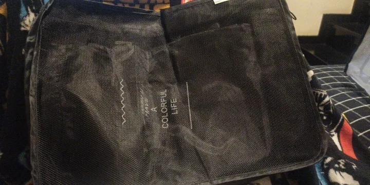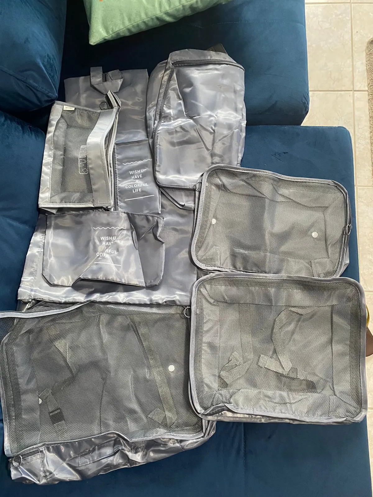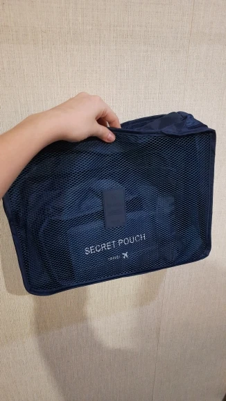 Всього в наборі 8 цих сумок: 2 нормального розміру - підійдуть для одягу спокійно; 2 для взуття - одна на блискавці посередині, інша виглядає як мішечок; 2 середнього розміру - підійдуть для нижньої білизни, шкарпеток і піжами разом складених; 2 косметички - звичайна непрозора і трохи об'ємніша з сіточкою. Якість не погана, за таку ціну, я б сказала, просто прекрасна. Синій колір гарний, насичений. Задоволена покупкою, з продавцем не спілкувалася.