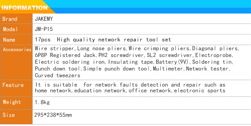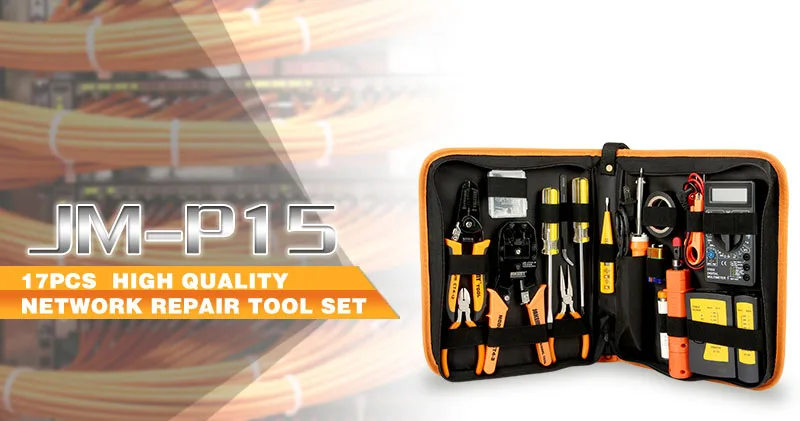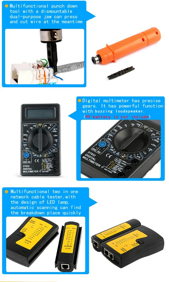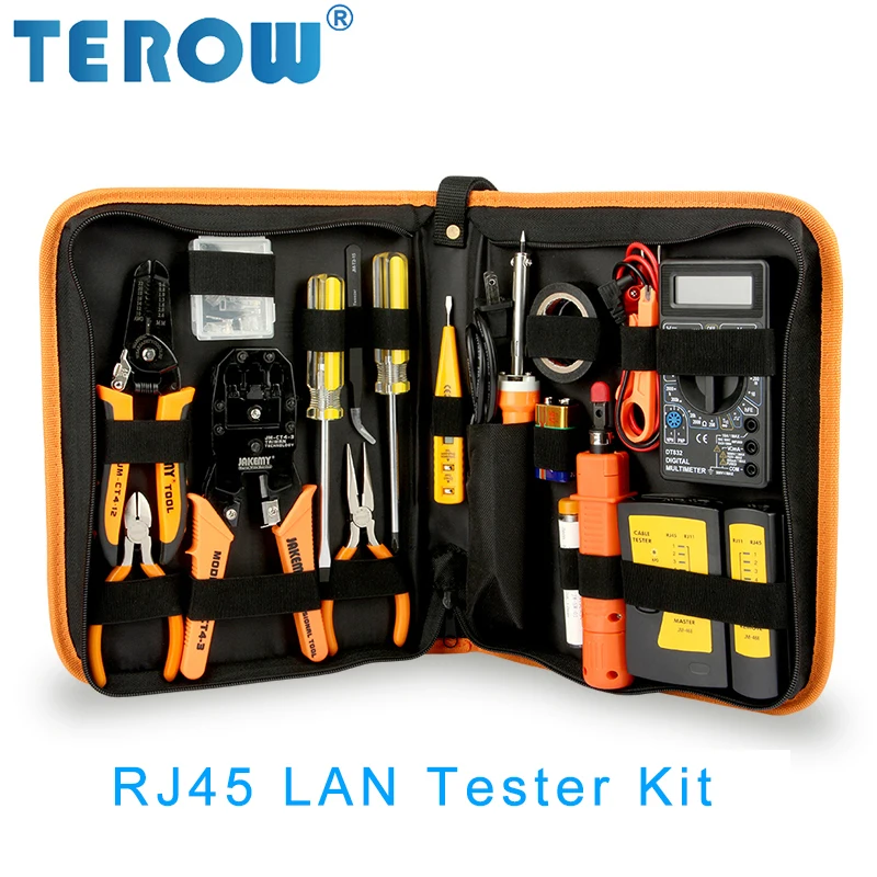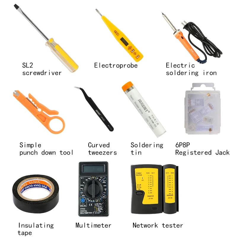 1 * Электрический паяльник1 * Инструмент для перфорации1 * простой инструмент для перфорации1 * сетевой тестер1 * электрозонд1 * изоляционная лента1 * мультиметр1 * паяльник1 * обжимные плоскогубцы1 * зачистки проводов1 * диагональные плоскогубцы1 * плоскогубцы с длинным носом1 * Изогнутый пинцет1 * отвертка Ph21 * отвертка SI21 * 6P8P Кабельный соединитель1 * сумка для инструментов