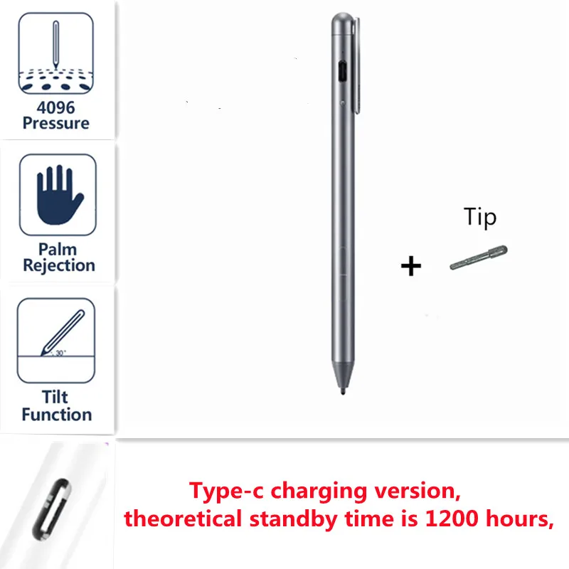 Это перезаряжаемый стилус TYPE-C, с защитой от прикосновения к ладони, технология WACOM Aes 2,0, поддержка бокового письма, сменные наконечники, 4096 уровней давления, позволяют лучше писать и рисовать, полная зарядка 100 минут может быть в режиме ожидания 50 дней,