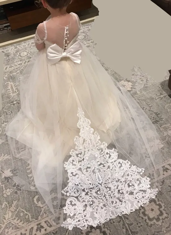 Пышное Тюлевое кружевное бальное платье, платья с цветами для девочек, платье принцессы с длинным рукавом, иллюзионное платье для девочек на свадьбу, вечеринку, Первое причастие