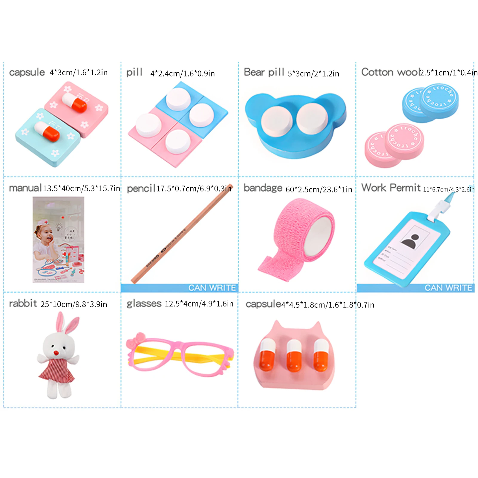 Упаковочный лист1 * Книга медицинских записей 1 * медицинская карта 1 * шприц 1 * мазь 1 * пинцет 1 * термометр 4 * абсорбирующий хлопок 2 * квадратные капсулы 1 * Сироп от кашля 1 * коробка для лекарств 1 * пластырь для ран 2 * медицина 1 * ножницы 1 * тканевый мешок 1 * стетоскоп 1 * Рабочая карта 1 * очки 1 * кролик 1 * ручка