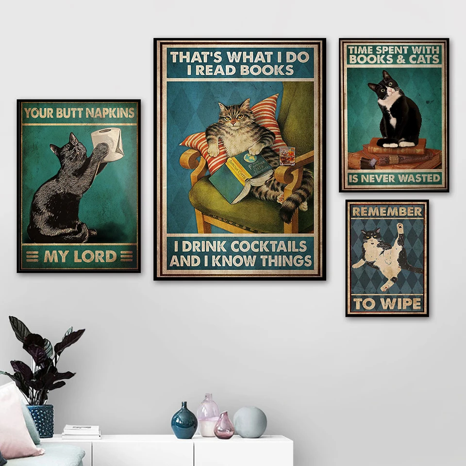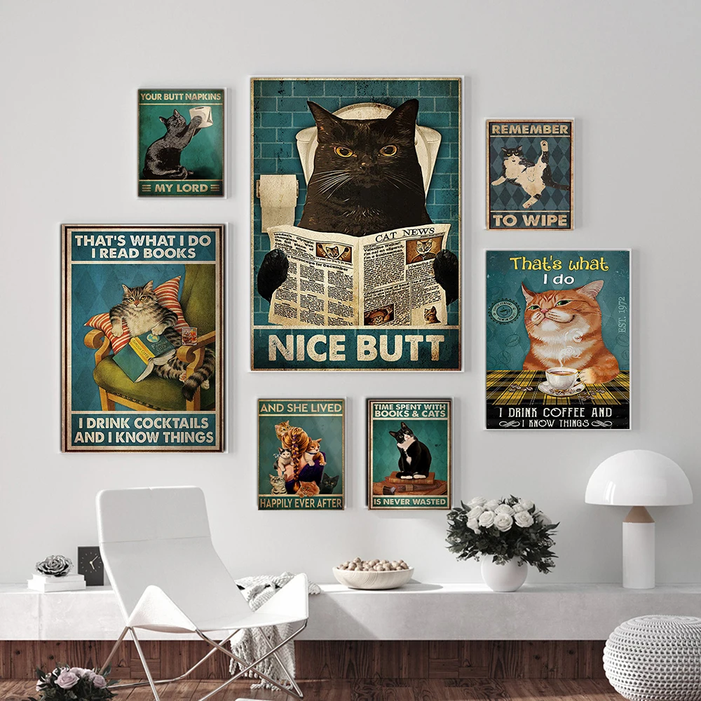 Картина на холсте с забавным интеллектуальным черно-белым котом, настенное искусство, винтажный красивый постер с ягодицами, печатные картины для ванной, домашний декор