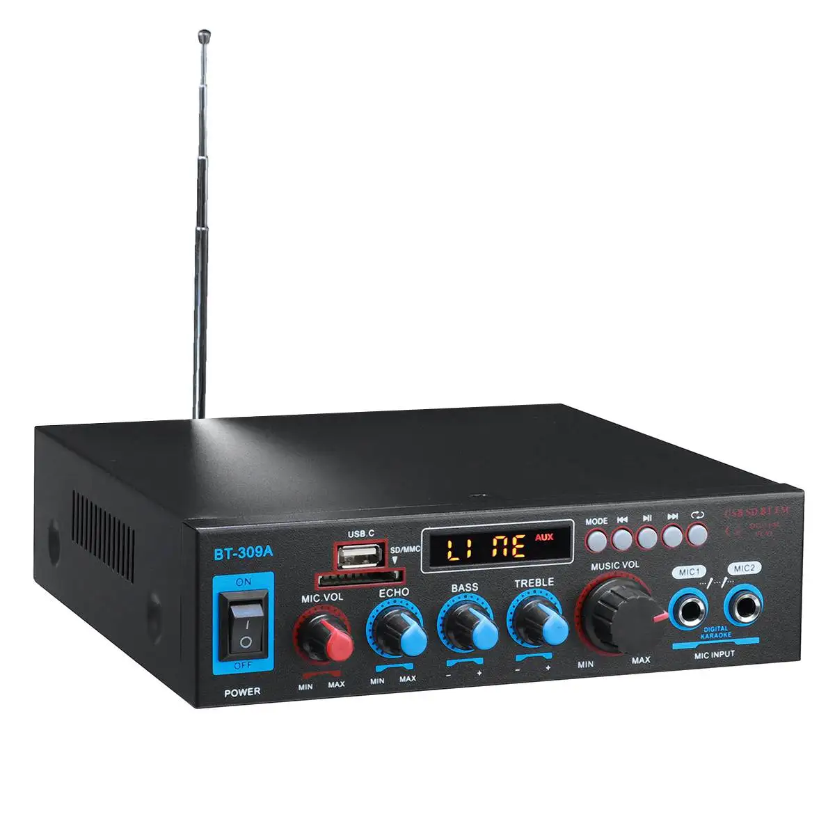 Особенности:-Мини HIFI Цифровой bluetooth аудио усилитель мощности.-TF карта, AUX, U диск, MP3 формат воспроизведения, поддержка bluetooth беспроводного подключения.-Поддерживает fm-стерео радио.-С высокими частотами, басами и регулятором громкости, очень прост в использовании.-Низкое Искажение обеспечивает более четкий, сильный и мощный звук.-Два выхода основного канала.-С функцией дистанционного управления.-Питание постоянного/переменного тока, подходит для дома или вашего автомобиля.-Модернизированная Высокая мощность 300 Вт + 300 Вт.-Он может автоматически переключать напряжение.-Малый вес, светильник.