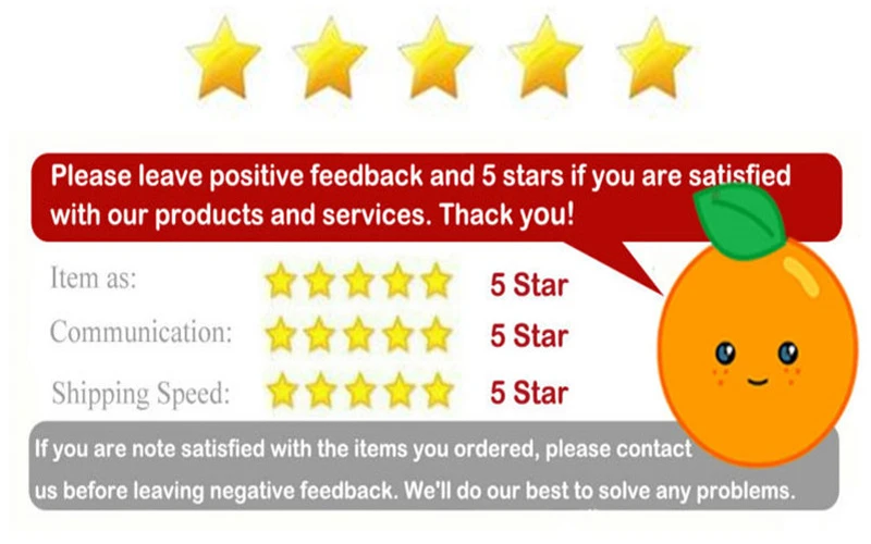 Если вы удовлетворены нашим обслуживанием и товаром, пожалуйста, оставьте нам положительный отзывы 5 звезд, и мы предоставим вам хорошие отзывы в ближайшее время. Если вы не удовлетворены нашим обслуживанием или продукцией, надеемся, что вы дадите нам возможность сделать вещи лучше, прежде чем оставить отрицательный отзывы. Пожалуйста, свяжитесь с нами в первый раз, если у вас есть какие-либо жалобы, мы будем терпеливо слушать вас и стараться изо всех сил, чтобы помочь вам решить проблемы, пока вы не будете счастливы. Бизнес непрост, надеемся, что мы сможем понять друг друга, цель для нас долгое время Купер на ионе, никогда не подводит вас.