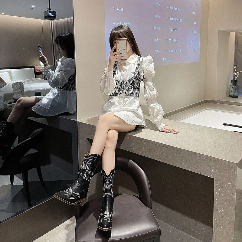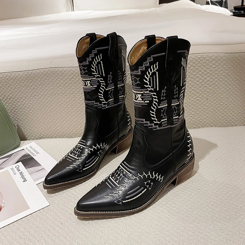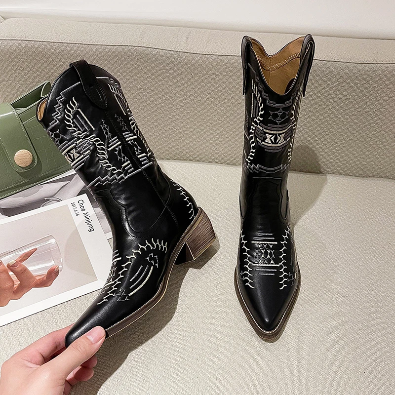 Женские ковбойские сапоги в ретро стиле, высокие узкие сапоги В рыцарском стиле с вышивкой и V-образным вырезом