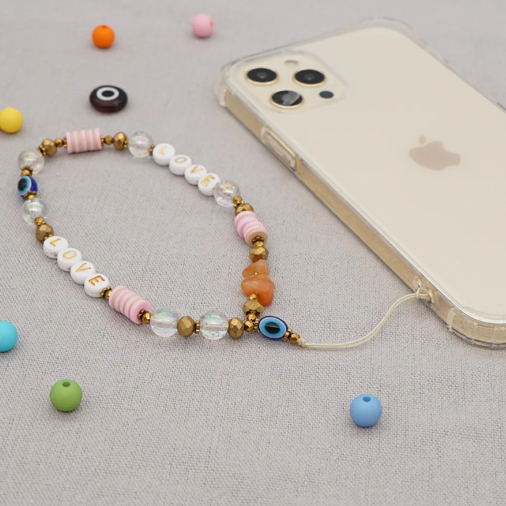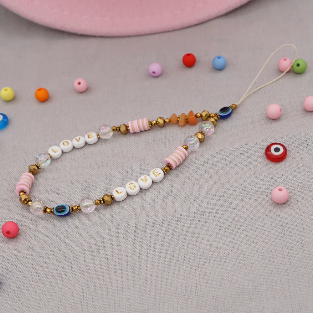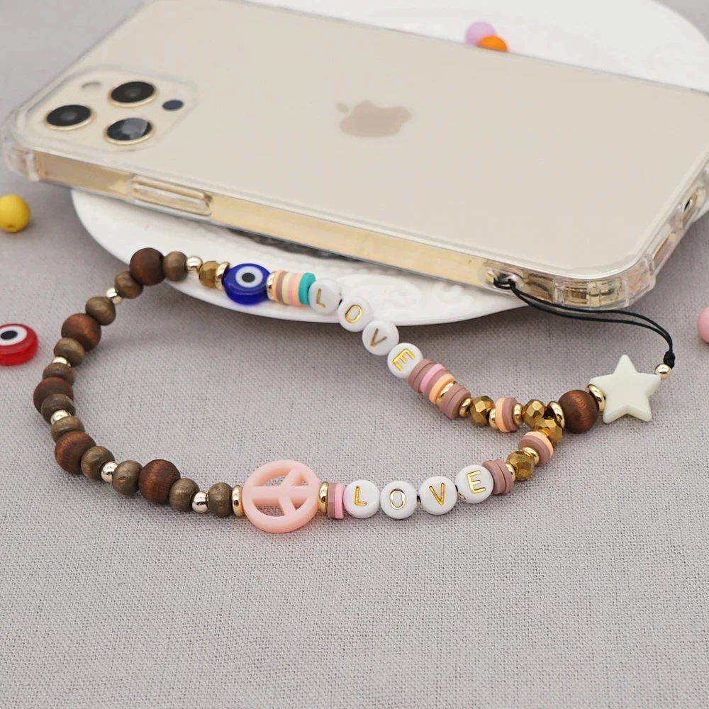 Новинка 2021, подвеска для мобильного телефона с надписью LOVE, Женская цепочка для телефона, знак мира, аксессуары для девочек, деревянный шнурок с бусинами для защиты от потери, ювелирные изделия