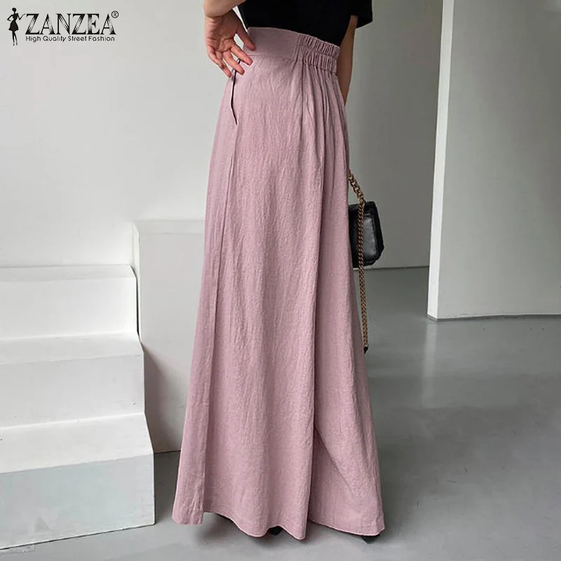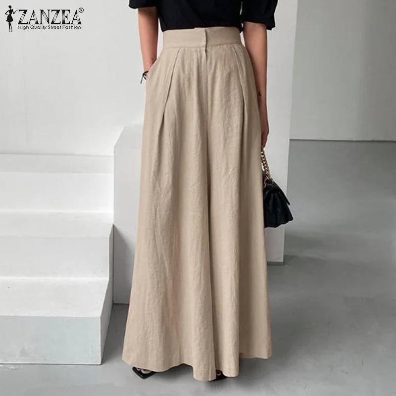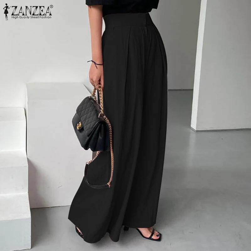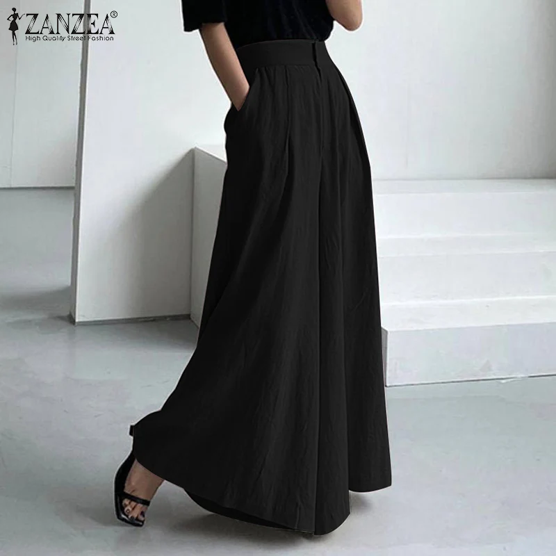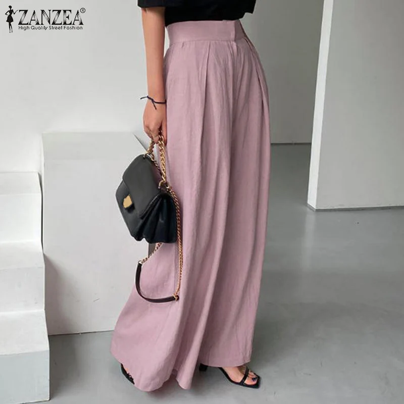 Брюки ZANZEA женские с широкими штанинами, модные элегантные однотонные свободные длинные брюки с завышенной талией, офисная одежда в стиле палаццо, большие размеры, на лето