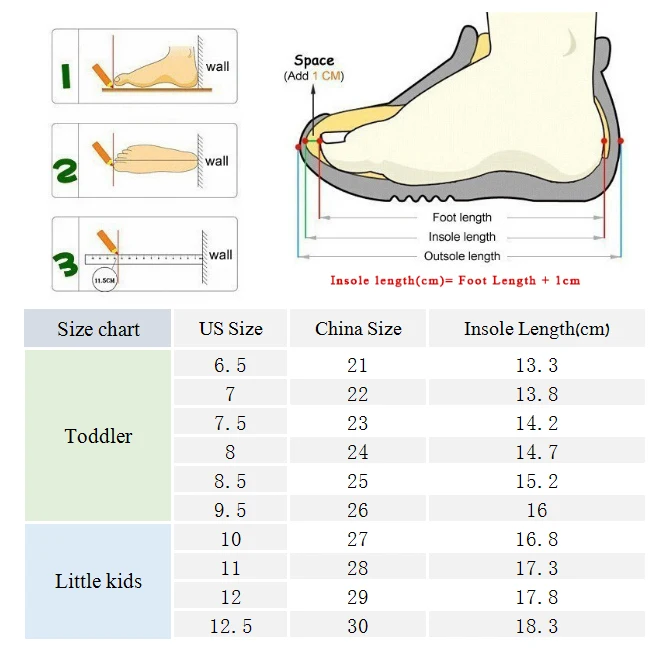 Пожалуйста, выберите больший размер для детей, детские ноги растут очень быстро, и вам нужно некоторое время, чтобы получить обувь