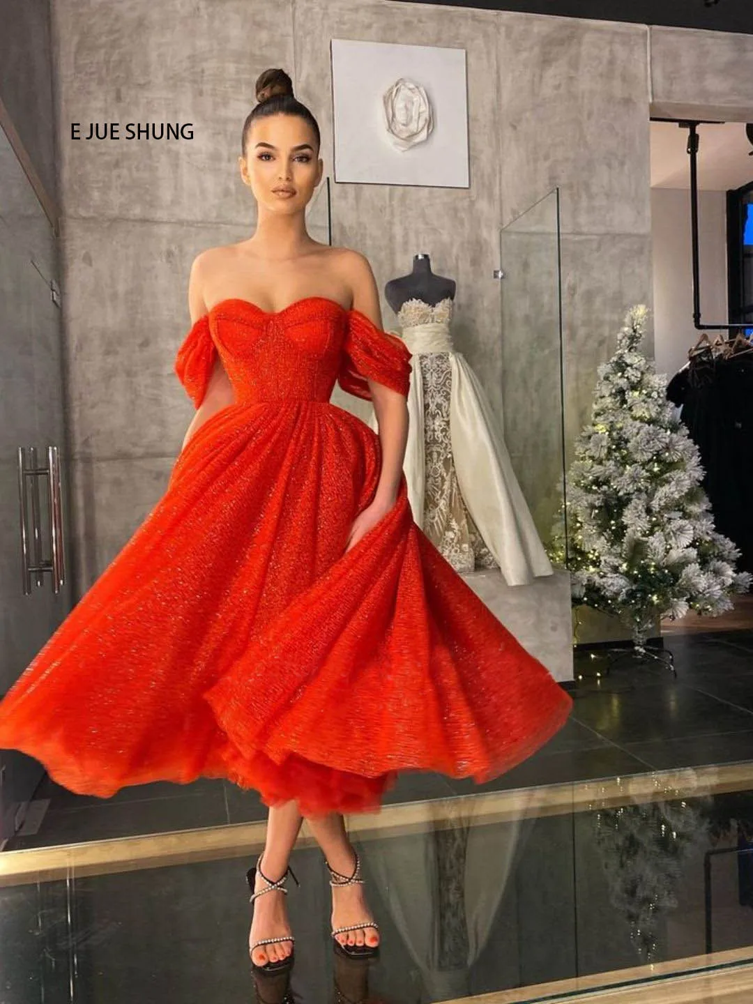 Роскошные Красные Свадебные платья E JUE SHUNG из блестящей ткани, свадебные платья с открытыми плечами и шнуровкой сзади длиной ниже колена, свадебное платье