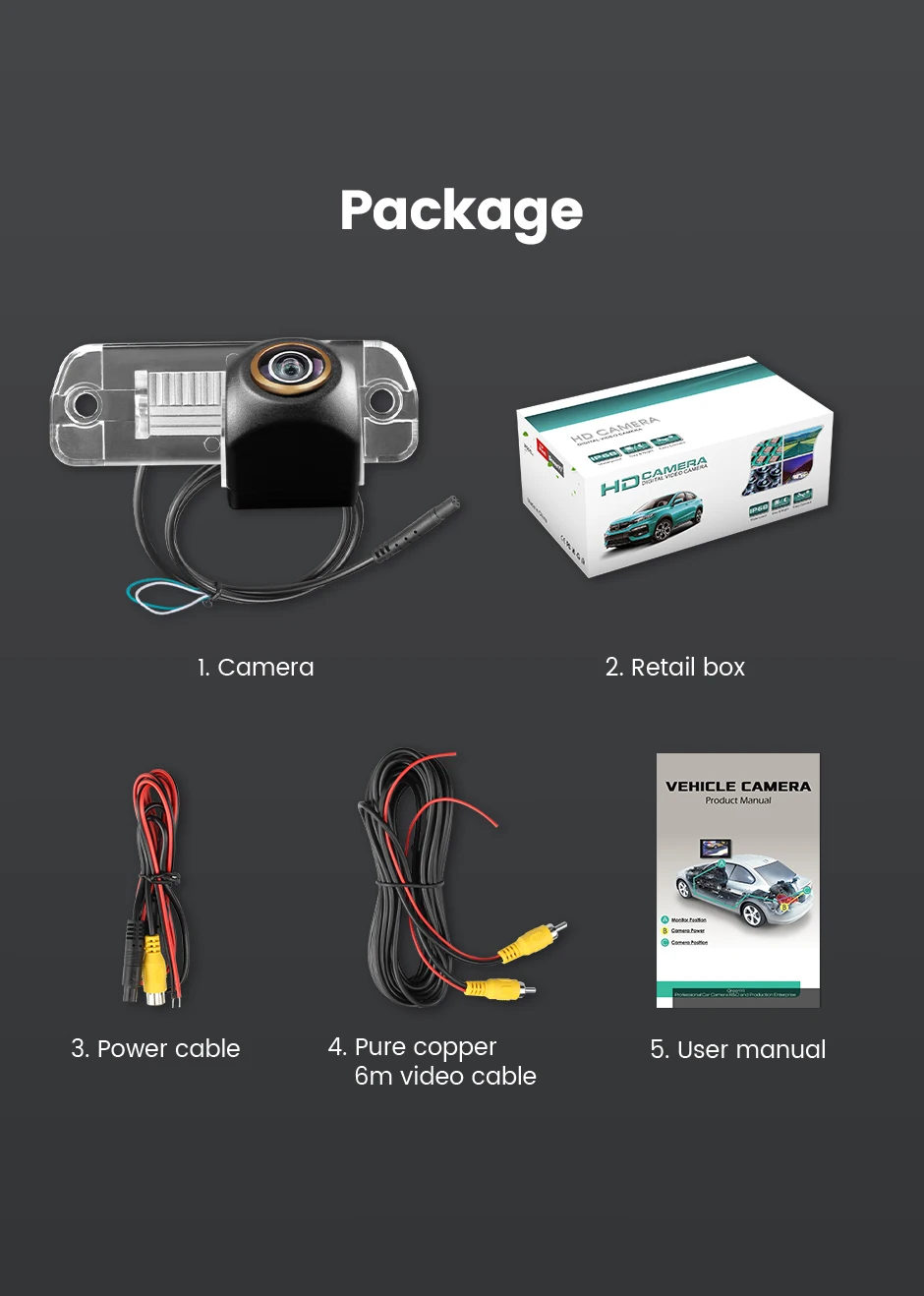 1. Камера заднего вида2. Розничная коробка3. Кабель питания4. Видеокабель из чистой меди 6 м5. Руководство пользователя