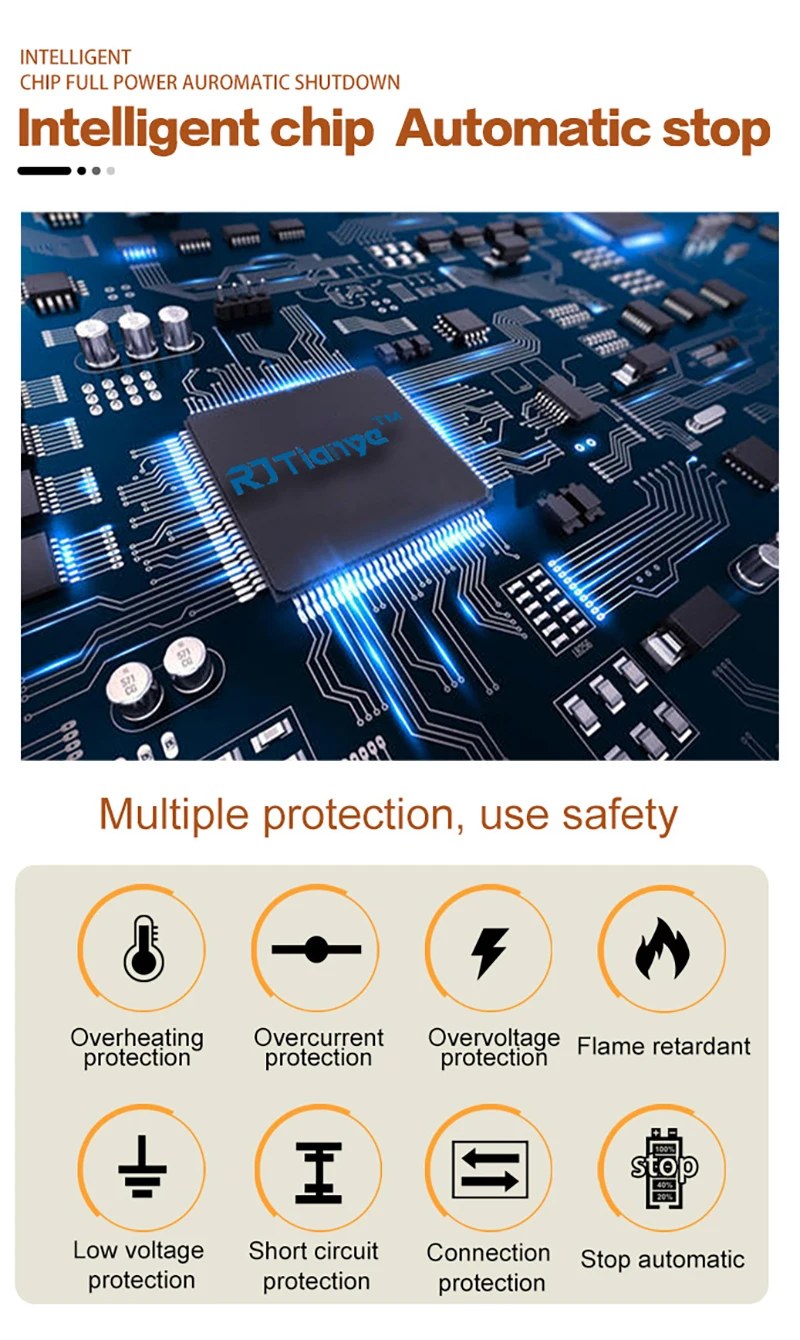Многократная защита, безопасность использования: защита от перегрева, защита от перегрузки по току, защита от перенапряжения, огнестойкость, защита от низкого напряжения, защита от короткого замыкания, защита от подключения, автоматическая остановка