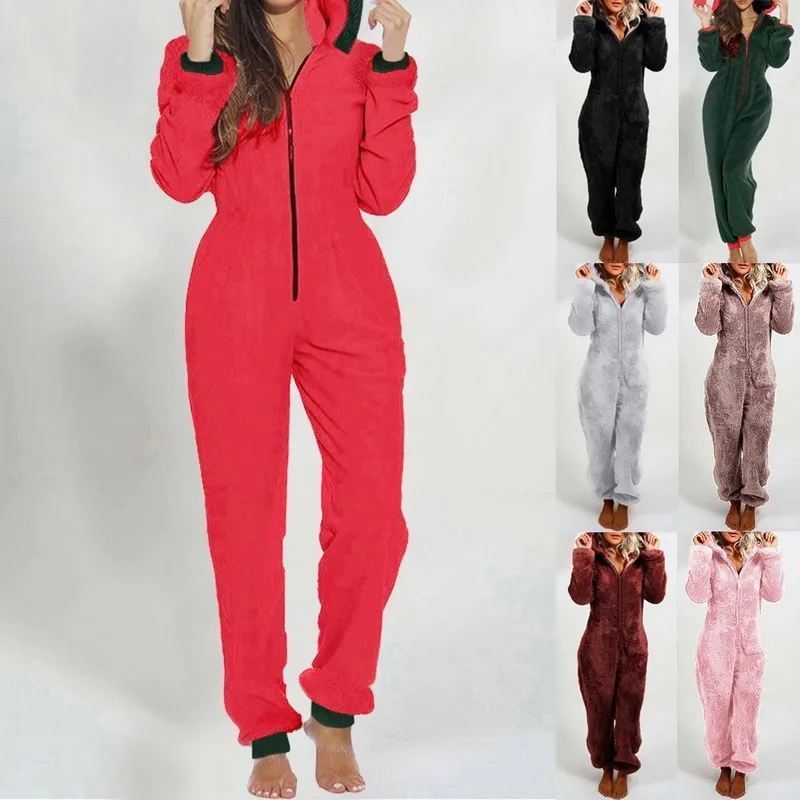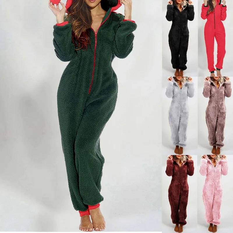 Женский Плюшевый комбинезон с длинным рукавом, зимний теплый комбинезон, ночная одежда, пижама с капюшоном и плюшевой подкладкой, Женская домашняя одежда