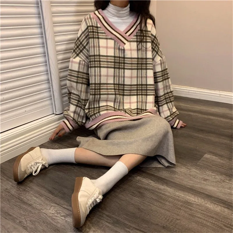 Женский клетчатый свитер с V-образным вырезом, в стиле Харадзюку