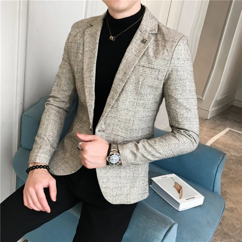 Новинка, мужские блейзеры, Классический Клетчатый Мужской приталенный деловой Повседневный блейзер в британском стиле, мужская верхняя одежда высокого качества, модная куртка
