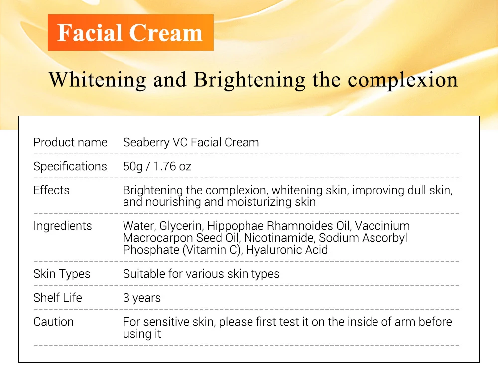 Название продукта: крем для лица VCХарактеристики: 50 гЭффекты: Осветление ЛИЦА, отбеливание кожи, Улучшение тусклой кожи, Питательная и увлажняющая кожаИнгредиенты: вода, глицерин, хиппофаэ рхамноиды масло, привития макрокарпон семена ОИ, никотинамид, аскорбилфосфат натрия (витамин С), гиалуроновая кислотаТипы кожи: подходит для различных типов кожиСрок годности: 3 годаВнимание: для чувствительной кожи, пожалуйста, сначала проверьте его на внутренней стороне руки перед использованием