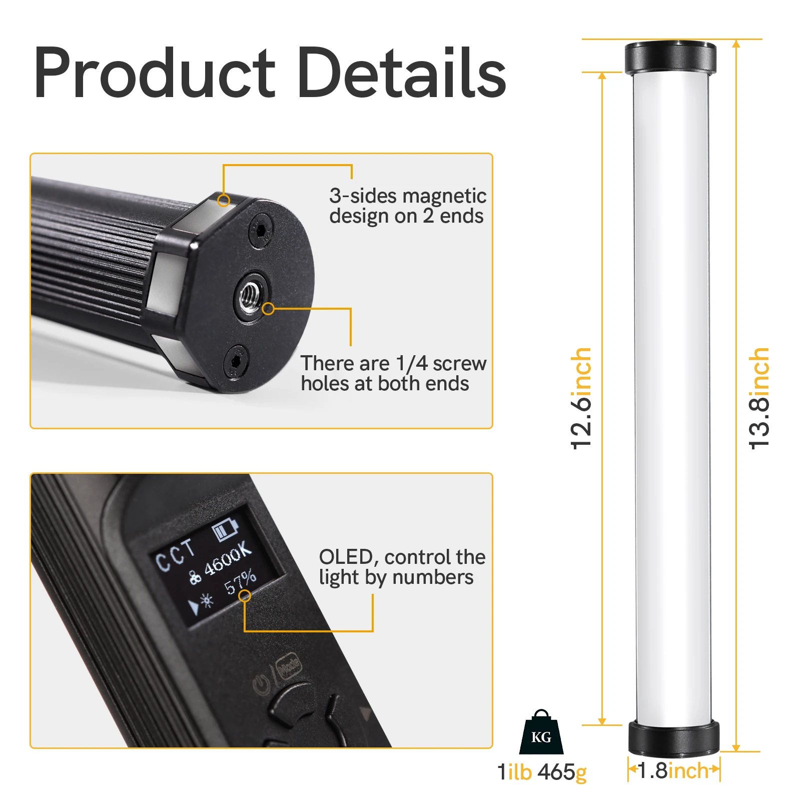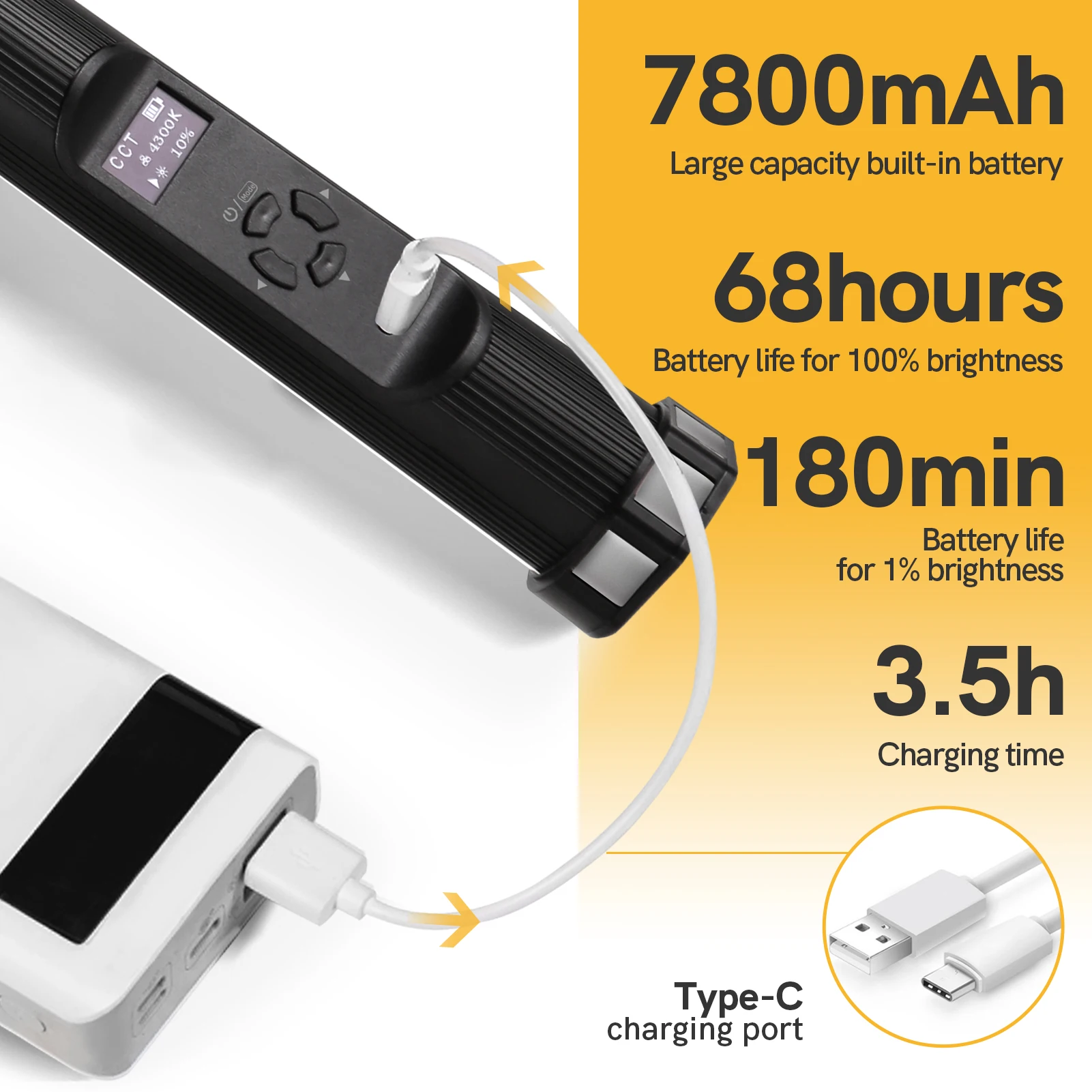 OLED дисплей для точные показания, вы сможете работать более эффективно. Встроенный 4000 мА/ч, литий-перезаряжаемый аккумулятор и Тип USB-C зарядки, 4,5 часов @ 6000k на 100% яркости.