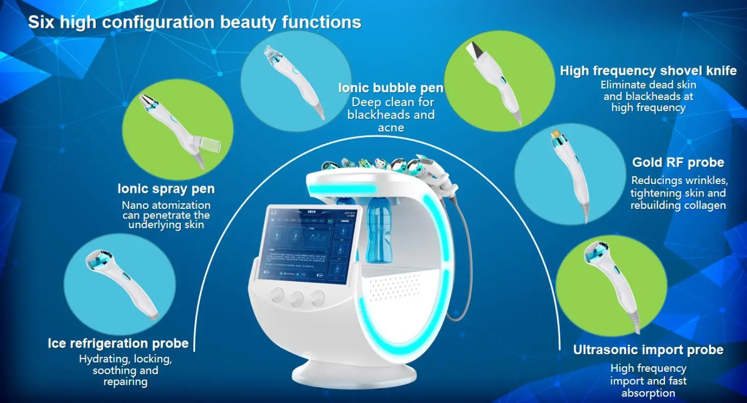 1) Ультразвуковая головка: стимулирует микроциркуляцию, омолаживает кожу2) многополярный RF: компактная форма, подтяжка лица3) био-микроток: дайте растянуть линию челюсти, био Поднимите общее затягивание кожи лица4) гидродермабразия: Очищение лица, пилинг, очищение пор5) холодный молоток: холодная кожа после интенсивной обработки6) пистолет тумана: нано-уровень распыления, легко впитывает эссенцию кожи.7) анализ кожи: 10-мегапиксельная камера для обнаружения возраста кожи.