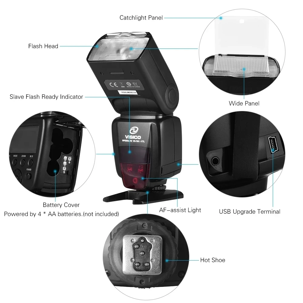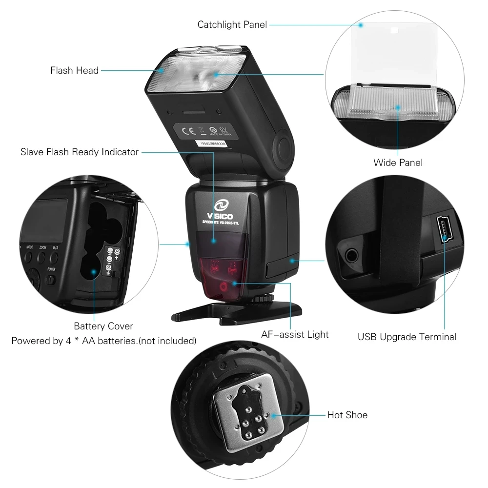 Copertura del Flash 24-105 мм; Gamma di Potenza da 1/1 a 1/128 di alimentazione; 5600k ± 200K temperatura di colore. Funzione di speednimento automatico; Porta USB per gli agjornamenti del прошивка. Alimentato da 4 batterie AA *.(Batterie non sono incluse.)