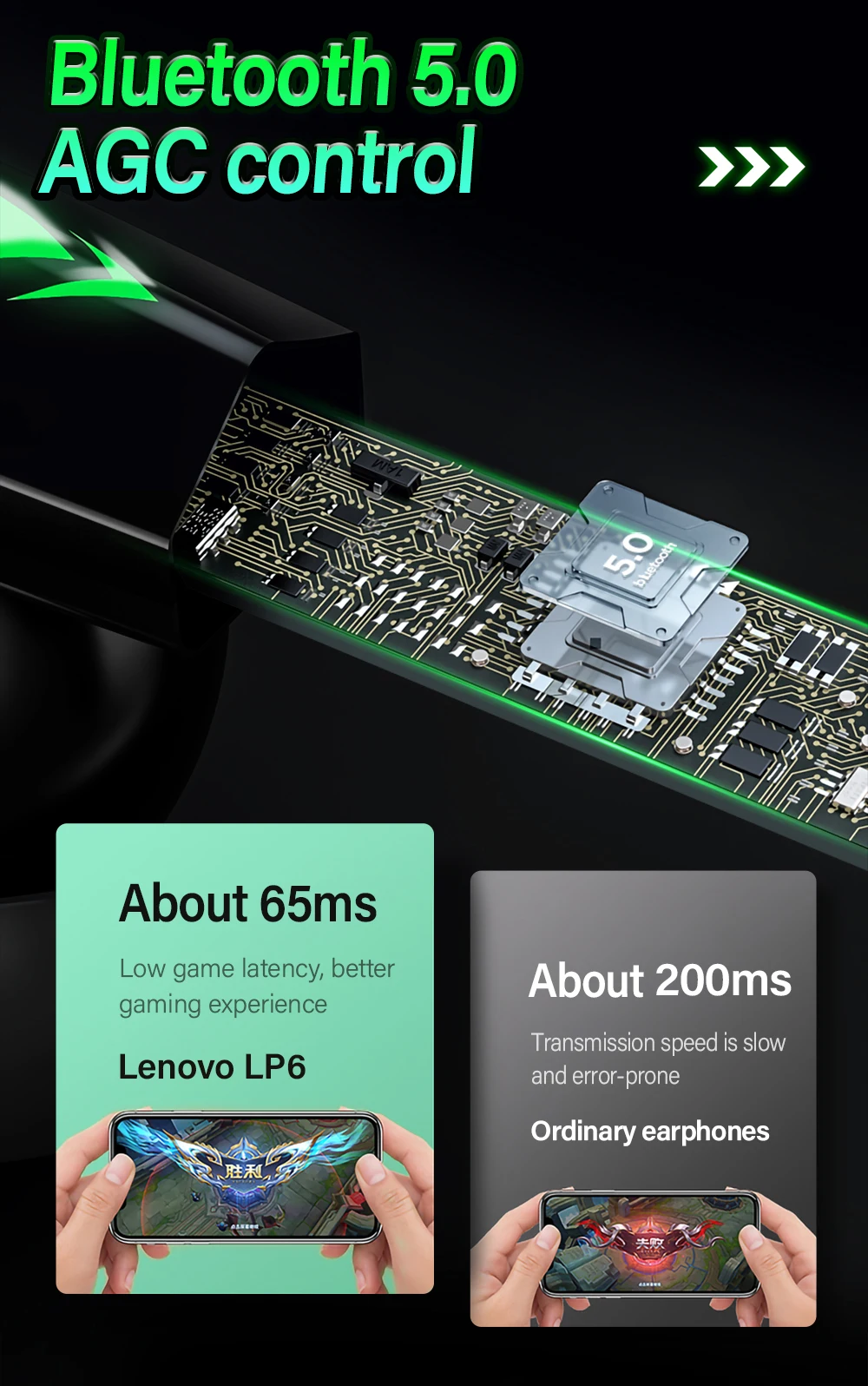 1. Низкая задержка, плавный игровой опыт.2. Bluetooth 5,0, стабильная передача звука.3. Декодирование аудио AAC.4. Интеллектуальное Шумоподавление для голосовых вызовов.5. Интерфейс Type-C, быстрая зарядка.