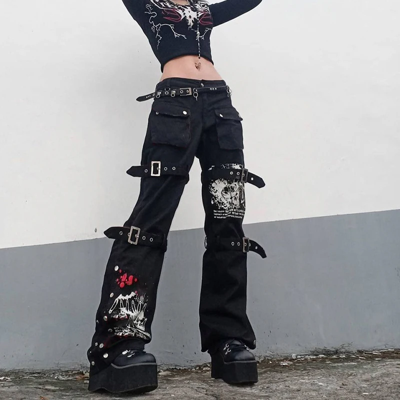 Yangelo Y2K панк, Череп, принт черные прямые брюки Harajuku с высок...
