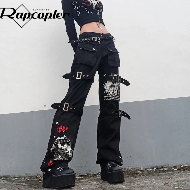 Джинсы Rapcopter женские с завязками, готические брюки из денима с принтом и карманами, винтажные Мешковатые повседневные брюки-карго с низкой талией в Корейском стиле, черные