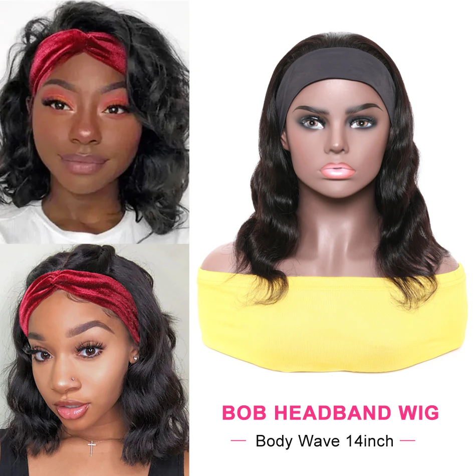 Короткий боб парик с головной повязкой человеческие волосы парики для чернокожих женщин без клея полный машина тела волна бразильские волосы парик с головной повязкой натуральный цвет