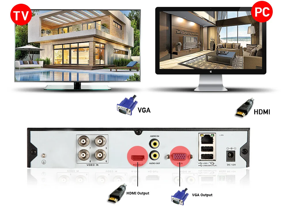 Просмотр на мониторе HDMIЛегко отображать видео через порт HDMI вашего монитора компьютера, чтобы в полной мере воспользоваться ясностью системы безопасности. (Кабель HD не входит в комплект)Просмотр по телевизору или монитору ПКДля дополнительного удобства видеорегистратор также поставляется с разъемами VGA и BNC для стандартных вариантов просмотра разрешения. (кабель VGA или BNC к RCA не входит в комплект.)