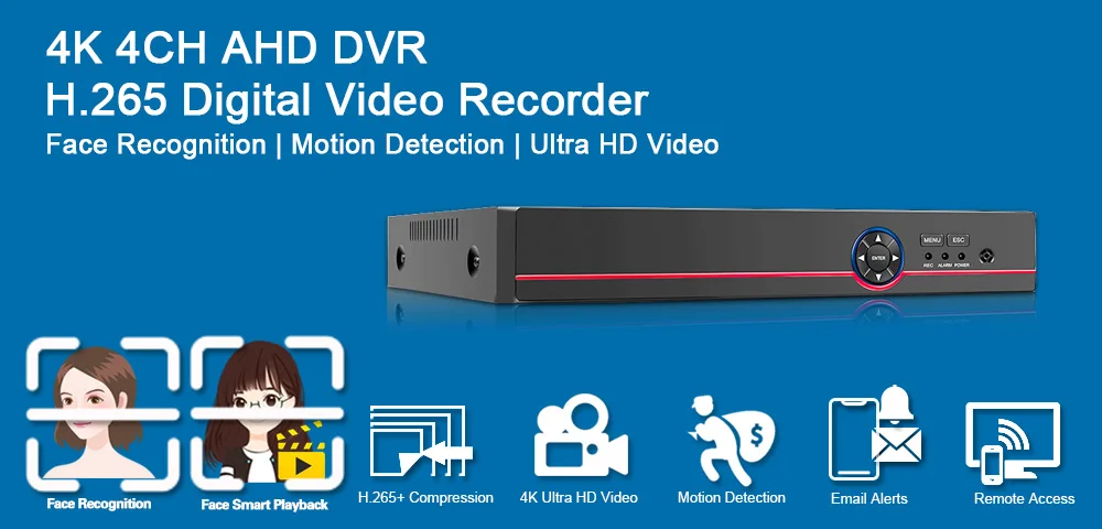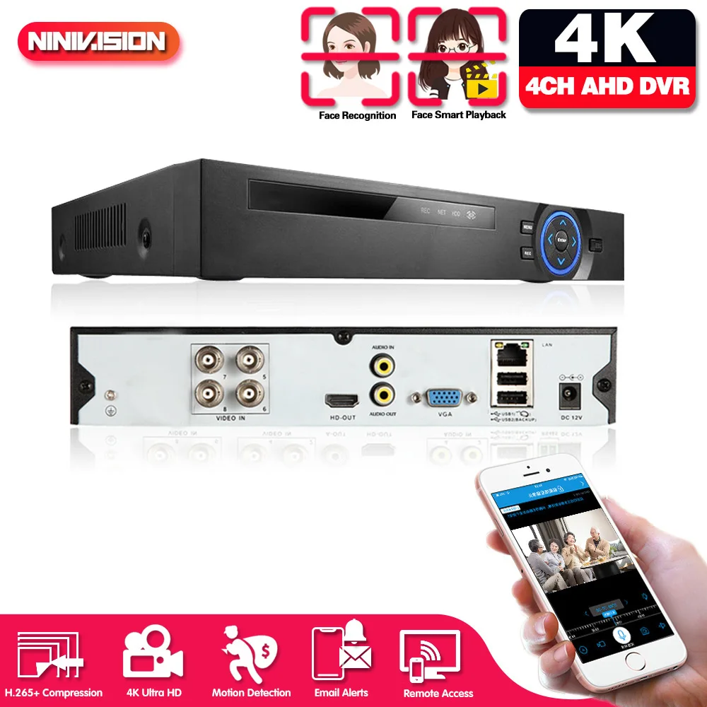 NINIVISION 4CH 8CH 16CH 4K 8MP 5MP 1080P Гибридный AHD DVR Запись AI Обнаружение движения человека Обнаружение лица и умное воспроизведение оповещения по электронной почте CCTV Аудио Видео Регистратор наблюдения 4 8 16 каналов 8.0MP 5.0MP 1080P NVR для безопасности система камеры