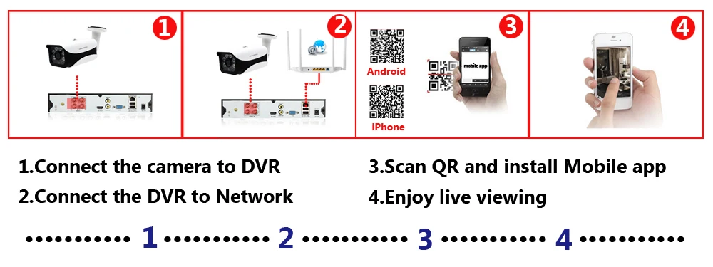 Простая настройка, всего 4 шага для просмотра мобильный телефон, просмотра видео в режиме реального времени из любого места и в любое время с помощью смартфона, стола или ПК с передовой технологией P2P, вы можете получить удаленный доступ к вашей системе за считанные минуты или меньше, нет необходимости в переадресации, удаленный доступ никогда не был таким простым!