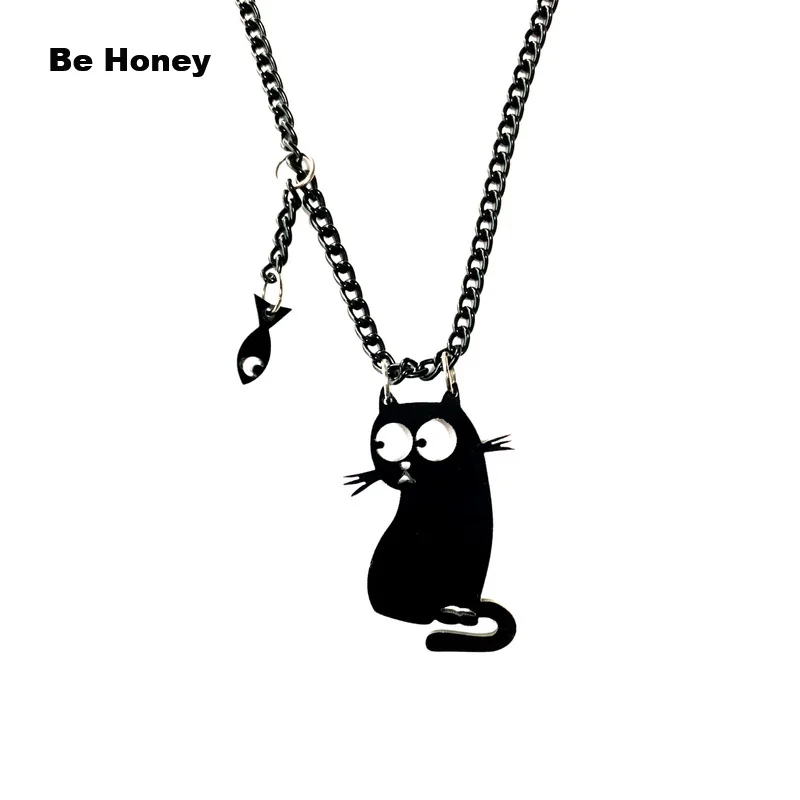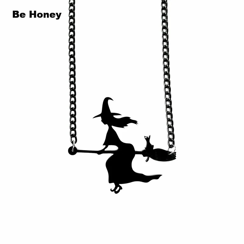 Новое поступление, чистый черный метла ведьмы, кошка и милая кошка с рыбой, акриловое ожерелье с подвеской для женщин, панк, модные ювелирные изделия, подарок