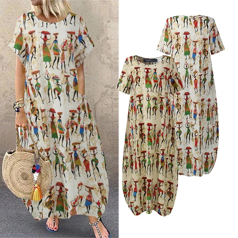 Женский летний сарафан ZANZEA, стильное платье макси с мультяшным принтом, Повседневная Туника с коротким рукавом, Женское Платье оверсайз с круглым вырезом