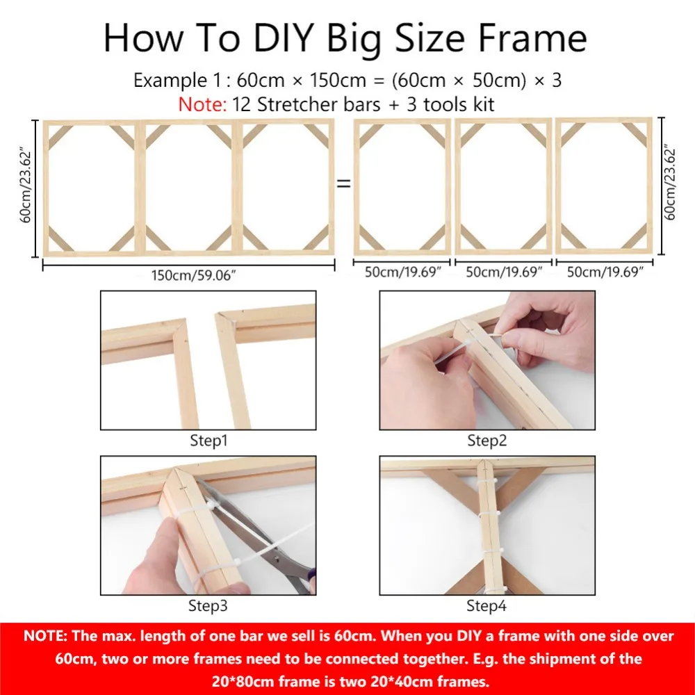 Разработанный, чтобы удовлетворить удовольствие от сборки DIY, набор носилок для холста может использоваться для крепления Безрамного изображения с помощью простых инструментов и шагов по эксплуатации.