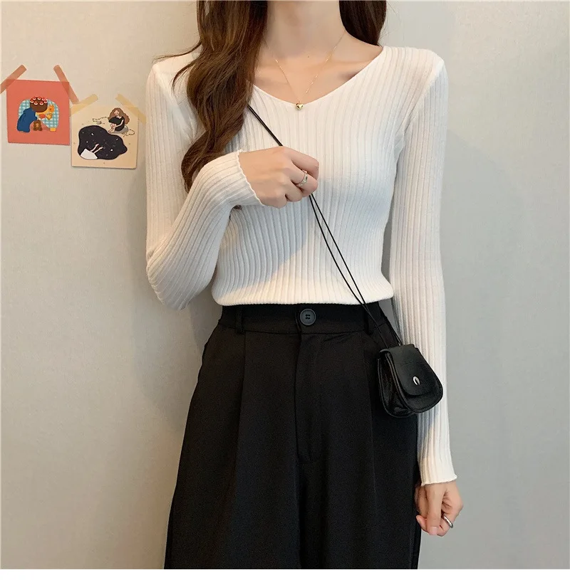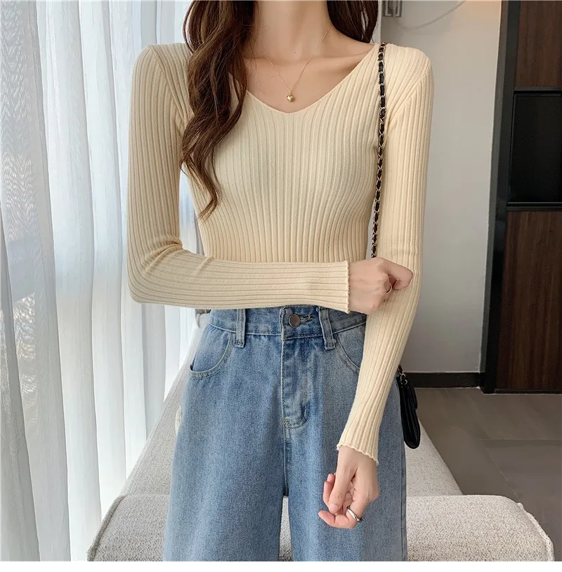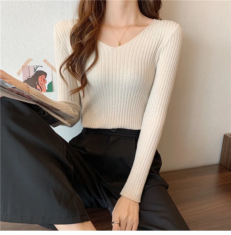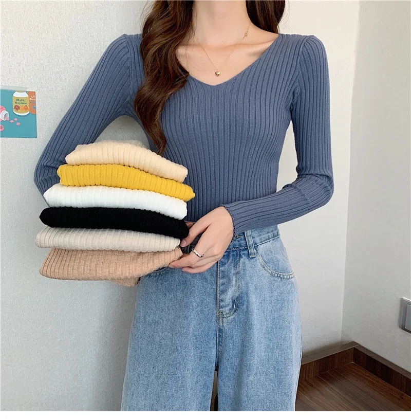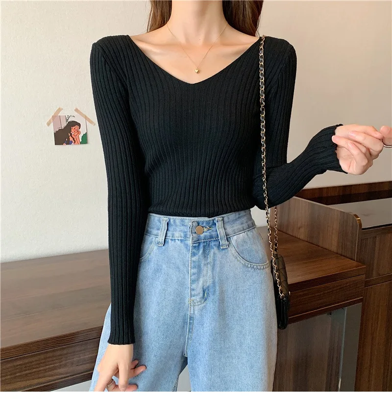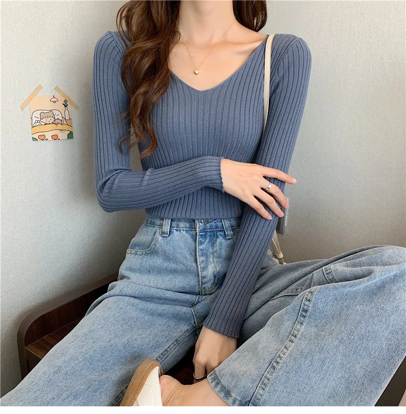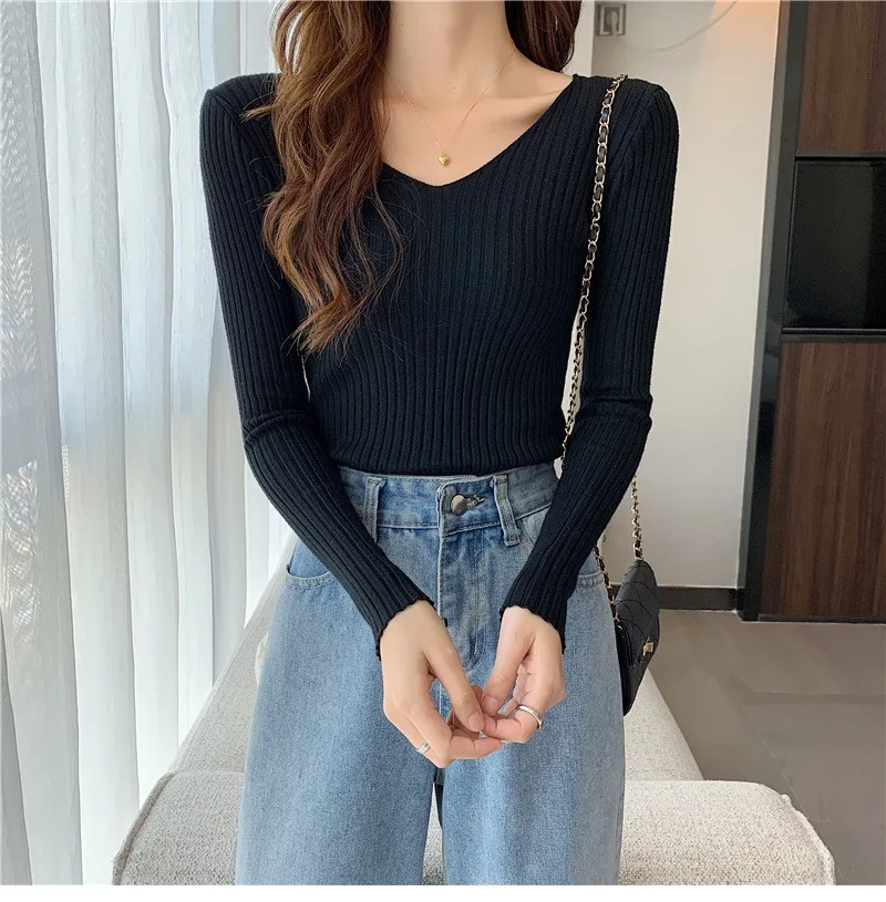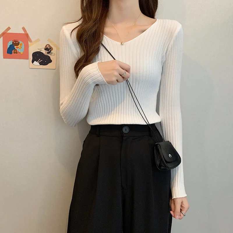 Новинка 2022, Женский облегающий пуловер с V-образным вырезом на осень и зиму, облегающий вязаный свитер с длинным рукавом, модные топы