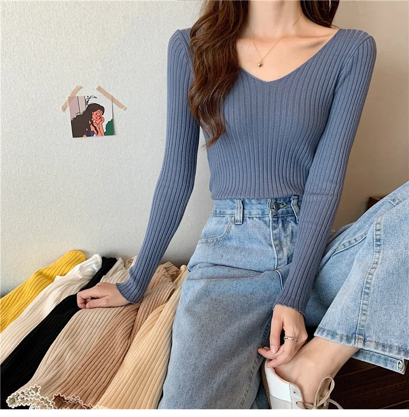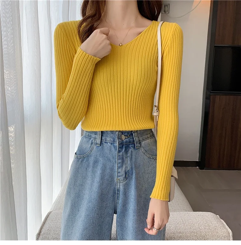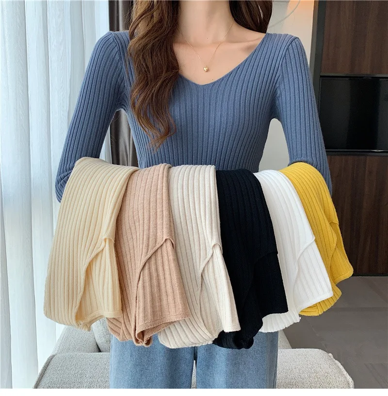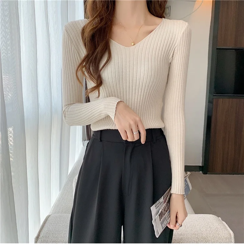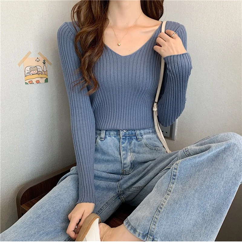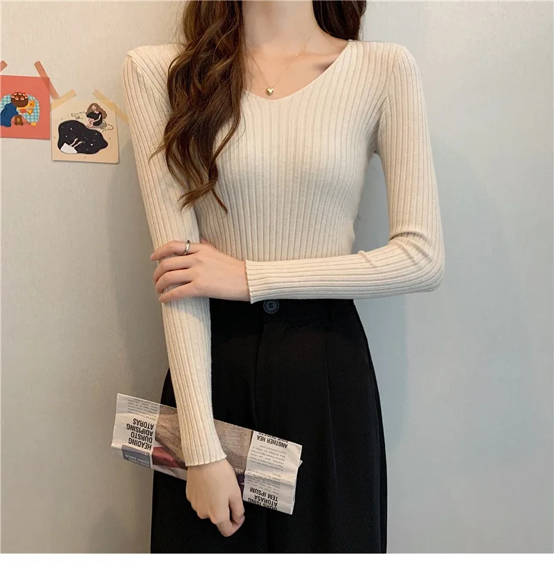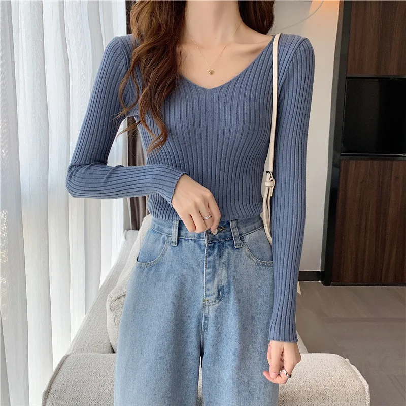 Новинка 2022, Женский облегающий пуловер с V-образным вырезом на осень и зиму, облегающий вязаный свитер с длинным рукавом, модные топы