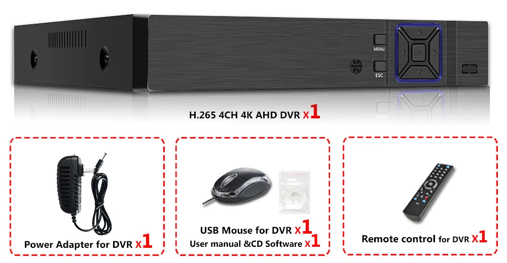 1 X H.265 4CH 4K 6 в 1 AHD DVR гибридный цифровой видеорегистратор;1 блок питания для DVR;1 USB-мышь для DVR;1 компакт-диск с программным обеспечением для DVR;1 х пульт дистанционного управления для DVR;Жесткий диск в комплект не входит!